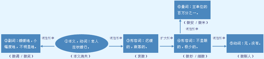 是 的本字。微,甲骨文 = (长发的老人)+ (手执棍杖),表示老人拄杖而行。金文 承续甲骨文字形。有的金文 加“辵” (行进),强调行进。造字本义:老人拄杖缓行。篆文 大体综合了金文 和 的字形,将金文的老人形象 写成 。 附 文言版《説文解字》:微,隱行也。从彳, 聲。《春秋傳》曰:“白公其徒微之。” 附 白话版《说文解字》:微,隐藏身份,悄悄行进。字形采用“彳”作边旁,“ ”作声旁。《春秋传》上说:“白公的门徒将他的尸体隐匿在山上。” 引申线索