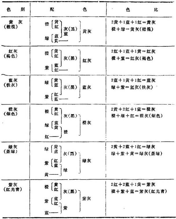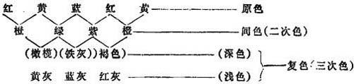 释义 | 二次色(间色)和三次色(复色) 三原色色相图如图10—5—3所示,中央部分为灰色或黑色,光谱七色分别位于圆周各处,圆周上各点为最鲜艳的各种色泽。红、黄、蓝三原色等量混合可以得到灰色或黑色,如将相邻的两种原色混合,可得到二次色(间色)、用两种二次色混合,或者任意一种原色与它对应的间色相混合所得到的颜色均为三次色(复色),其相互关系如图10—5—4所示。 从以上两图可以看出,每个二次色都是由两个原色配成,任何两个二次色配出的色均为灰色,但有红灰、黄灰、蓝灰之分。如将三角形色团展开,其色度层次如下所示: 从图10—5—4可以看出,任何两个间色相配呈灰色,任何两个问色与另一原色相配也呈灰色。 三原色的配色色变规律如表10—5—13所示。 表10—5—13 |