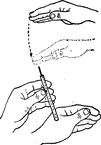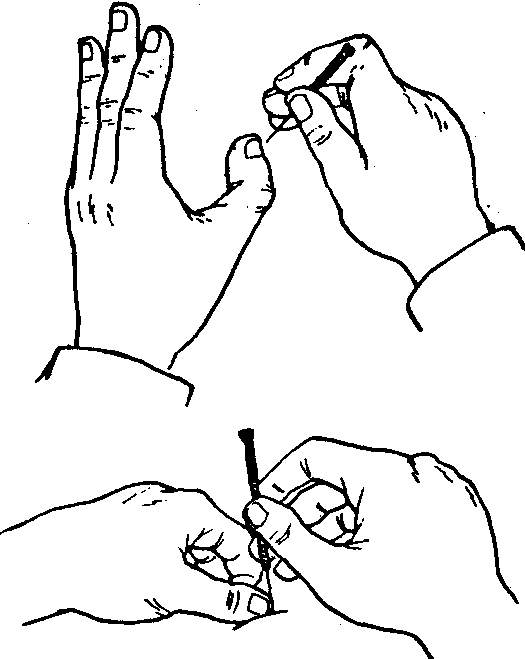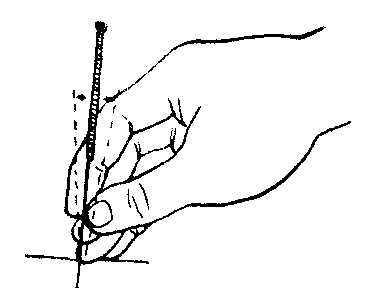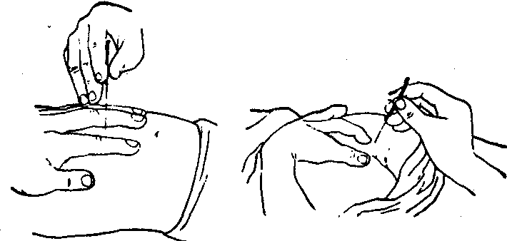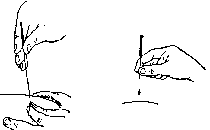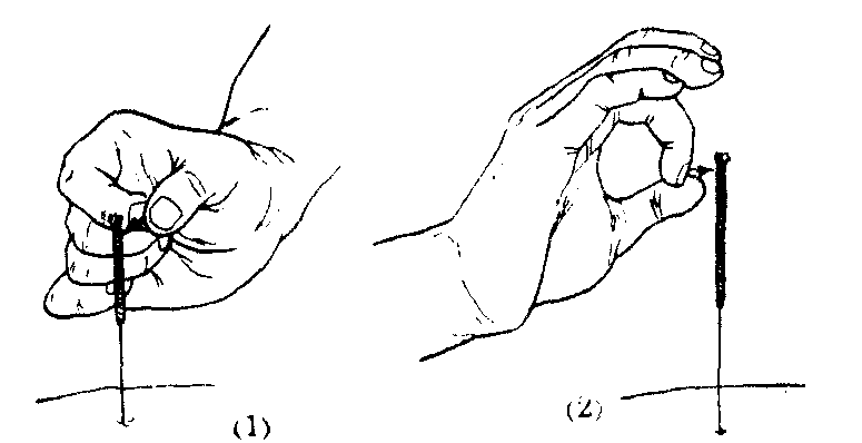 释义 | 毫针刺法 毫针刺法毫针是古代九针中的第七种,在针灸临床中应用最广泛,占有极其重要的地位。由于毫针针体纤细,必须具有一定的指力和技巧,才能准确无误地将针刺入机体,并进行各种手法的操作。因此,必须练指力,练捻转、提插、搓针、摇针等不同针刺技巧。练针时,可以在捆紧的棉团或纸垫上,或在软木上进行。将一些基本手法练熟之后,方可临证用针。(图1、2) 图1 纸垫练针法 图2 棉团练针法 进针法 在进行针刺操作时,一般用双手配合,将针刺入皮肤的方法,称进针法。临床上,多以右手持针,靠拇、食、中指夹持针柄(图3),称右手为“刺手”。左手按压针刺部位或辅助针身,称左手为“押手”。常用的进针法有如下几种。 图3 持针姿式 指切进针法 又称爪切进针法,是自古流传下来的最常用的一种进针方法。此法是以押手拇指或食指指端按在腧穴位置的旁边,以刺手持针紧靠指甲面将针刺入腧穴的方法。它适用于短针的进针。(图4) 夹持进针法 又称骈指进针法,是从押手拇指和食指夹捏消毒干棉球裹住针体下端,将针尖对准穴位,刺手捻动针柄,左右两手配合将针刺入腧穴的方法。此法适用于长针的进针。(图5) 捻转进针法 是用刺手拇、食指或拇、食、中指夹持针柄,将针尖对准穴位,一左一右地轻轻捻动针柄(捻转角度不超过180°),边捻边向下加力,将针刺入穴中。此法适宜于初学者。 舒张进针法 是用押手拇、食两指或食、中两指将所刺腧穴部位的皮肤向两侧撑开,使皮肤绷紧,刺手持针,使针由左手拇、食或食、中指间刺入腧穴。此法主要适用于皮肤松弛部位的腧穴。(图6) 提捏进针法 是用押手拇、食两指将穴位皮肤捏起,刺手持针,由捏起皮肤的一端将针刺入。此法主要适用皮肤浅薄部位的腧穴进针。(图7)管针进针法 是将特制的针管置于穴位上,把针放入管中,针柄稍高出针管,用右手食指或中指弹击或叩打针尾,将针刺入皮内。然后退出针管,再将针捻入或直接刺入穴中。此法适用于短针的进针。(图8) 图4 指切进针法 图5 夹持进针法 图6 舒张进针法 图7 提捏进针法 图8 管针进针法 单手进针法 是用刺手的拇、食指持针,中指端紧靠穴位,指腹抵住针身下段,当拇、食指向下按压时,中指随之屈曲,将针刺入。此法适用于较短毫针的进针。(图9) 进针后手法 是指进针之后到出针之前的操作方法;针法的精华均在于此。它包括基本手法和复合手法。这些方法最早见于《黄帝内经》,历代均有发展。南宋的席弘,金元的窦汉卿,明代的陈会、徐凤、高武、李梴、杨继洲等,都很重视手法,并在各自的著作中,罗列出手法的类别、名称、操作要领和用途。《针灸大全》一书中收载的《金针赋》,尤其详于手法。 图9 单手进针法 基本手法 基本手法是针刺的基本操作方法,是由一种或两种基本动作组成的手法,包括以下三个方面的内容: ❶单一的基本动作,如揣、爪、搓、弹等; ❷相反相成的两种基本动作,如提插、进退等; ❸两种基本动作结合为一个连续动作,如搬垫、飞推等。基本手法是构成复合手法的基本要素。在通常情况下都是右手持针,左手循、摄、爪、切等。杨继洲的下手八法就有一半是属于左手操作的。 窦汉卿在《针经指南》里总结出十四种基本手法,即动、退、搓、进、盘、摇、弹、捻、循、扪、摄、按、爪、切等十四法,是基本手法的核心内容。 (1)动: 是催气运气手法之一。将针在体内进行或提或摇或转。《针灸问对》说:“动,凡下针时,如气不行,将针摇之,如摇铃之状,动而振之,每穴每次须摇五息,一呼一摇,按针左转,一吸一摇,提针右转,故曰动以运气。” (2)退: 是指出针时先退一豆许,稍留针,然后出针。《针经指南》说:“退者,为补泻欲出时,各先退针一豆许,然后却留针,方可出之,此为退也。” (3)搓: 是指行针过程中将针往一个方向捻转而言。因得气而针被吸紧。在紧度适宜的情况下,结合提插捻转可以出现凉感或热感。《针灸问对》说:“搓,下针之后,将针或内或外,如搓线之状,勿转太紧,令人肥肉缠针,难以进退,左转插之为热,右转提之为寒,各停五息久,故曰搓以使气。” (4)进: 是将针由浅部刺入深部的手法。一般按天、地、人三部(也称三才)次序进入,或转针而进,或推针而进。《针经指南》说:“进者,凡不得气,男外女内,及春夏秋冬,各有进退之理,此之为进也。”这里的春夏秋冬是指春夏宜浅刺,秋冬宜深刺而言。 (5)盘: 是专用于腹部的一种针刺手法,针刺入腹部穴位后,将针扳倒进行盘转。(图10)《针灸问对》说:“盘,如针腹部软肉去处,只用盘法……其盘法如循环之状,每次盘时,各须运转五次,左盘按针为补,右盘提针为泻。故曰盘以和气 。” 图10 盘法 (6)摇: 是出针时使用的一种手法。(图11)《针经指南》说:“摇者,凡泻时,欲出针,必须动摇而出者是也。”《针灸问对》说:“摇,凡退针出穴之时,必须摆撼而出之,青龙摆尾亦用摇法,故曰摇以行气,此出针之法也。”这与《内经》中之“摇大其孔”不同,前者属行气法,而后者为一种泻法。 图11 摇法 (7)弹: 是弹动针柄的一种手法,具有催气和行气的作用。弹法一般在得气的基础上进行。(图12) 图12 弹法 (8) 捻: 是以手指捻转针柄使针旋转,系重要的基本手法之一,经常和九六、呼吸等方法结合在一起构成多种复式手法。《针经指南》说:“捻者,以手捻针也,务要识乎左右也。左为外右为