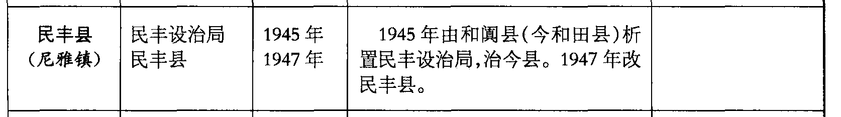 民丰县(尼雅镇)民丰设治局民丰县1945年1947年1945年由和阗县(今和田县)析置民丰设治局,治今县。1947年改民丰县。
