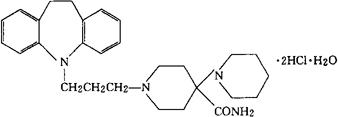 C28H35N4O·2HCl·H2O=537.57 CAS-7075-03-8 1′-[3-(10,11-二氢-5H-二苯并[b,f]氮杂 -5-基)丙基]-1,4′-(联哌啶)-4′-甲酰胺二盐酸盐,一水化合物。 1′-[3-(10,11-Dihydro-5H-dibenz[b,f]azepin-5-yl)propyl]-(1,4′-bipiperidine)-4′-carboxamide dihydrochloride monohydrate. 抗抑郁药。 盐酸卡匹怕明,盐酸卡匹明。 Carpipramine Dihydlochroride,Prazinie.  |