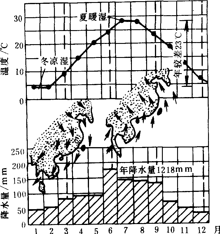 图 4 副热带季风气候综合图(上海, 31.2°N, 121.43°E) 直方图、玫瑰图 表示的影响因子与所研究气候要素间的关系常具离散型特点,如各月降水量直方图、风玫瑰图等, 影响因子常只有一个。还有 一些其它形式的图, 如圆形图用来表示云量、某要素各组成部分的比例等。 统计曲线图 气候要素频率分布曲线和保证率曲线图是另一种性质的线条图, 反映单一要素内部的统计特性(图3)。频率分布曲线常在绘制频率直方图的基础上制作(图3中曲线1), 而保证率曲线(或累积频率曲线) 则是在频率曲线基础上累加的结果 (图3中曲线2)。 气候分析中还绘制综合图(包括各种线条图、直方图以及各种符号), 以综合反映气候, 如图4。该图反映出上海的年降水量和气温年变化, 以及中国东部沿海地区的冬、夏两季的盛行风方向。气候图表示气候特征和气象要素等时空分布、变化、相互关系等的图示。 气候图climate (/climatic)map;climatic chart |
