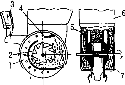 图1 气吸式排种器 1.吸种盘 2.橡胶搅拌轮 3.吸气管 4.刮种板 5.挡板 6.种子箱 7.种子室