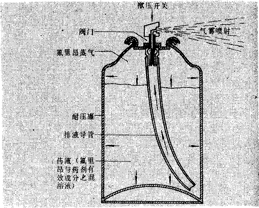 释义 | 气雾剂aerosols利用发射剂急骤气化时所产生的高速气流将药液分散雾化的一种罐装剂型。分为油质气雾剂和水质气雾剂两大类,前者药液为油质溶液,后者药液为水悬液。这种剂型在常压下不能存在,必须灌装在一耐压罐中。耐压罐装有一只揿压喷嘴,使用时揿下,药雾即从喷嘴喷出。气雾剂最早于1943年问世,早年的气雾剂用完后空罐可以回收重新灌装。1947年出现了一次使用性的气雾弹(disposolaerosol bomb)。气雾是一种高度分散的气溶胶,近似于烟雾(见烟雾法),粒子小而均匀。气雾剂体积小携带方便,操作简便,特别适用于家庭和公共场所。 气雾弹示意图 气雾剂药物剂型之一。 系指药物和抛射剂共同封装于带有阀门的耐压容器中,使用时借抛射剂气化所产生的压力,定量或非定量地将药物以雾状喷出的制剂。喷出药物经呼吸道或皮肤、黏膜吸收产生效用。 气雾剂aerosol见“雾剂”。 气雾剂aerosol又叫气溶胶,系一种能喷射成气雾状微粒的药物制剂。其制法是将药物和抛射剂一同封装入耐压容器中,使用时借抛射剂的压力,将药物喷出。主要用于呼吸道吸入,口腔粘膜及皮肤等处的治疗。其优点是直接到达病变处,发挥药效快。 气雾剂 气雾剂气雾剂是将药物与抛射剂同包装在耐压容器中。应用时打开阀门,依靠抛射剂的压力,将内容物喷射出来,主要呈雾状。气雾剂可作为自呼吸道(主要是肺)吸入给药或皮肤粘膜给药的剂型,也可作空间消毒之用。气雾剂中药物,直接喷到作用部位或吸收部位,因此起效快、剂量也可减少。例如异丙肾上腺素气雾剂主要在肺泡和肺泡管吸收,这些组织不仅血液流量十分大,而且在肺泡内的药物与肺毛细血管间仅隔极薄的肺泡壁,距离十分微小,药物穿透甚快。肺泡的表面积巨大,故吸收甚速,1~2分钟即起平喘作用。 阀门构造图 ☚ 滴丸 埋植剂 ☛ |