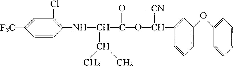 释义 | 氟胺氰菊酯fluvalinate又称马扑立克、Mavrik。化学名称:N-(2-氯-4-三氟甲基苯基)-DL-α-氨基异戊酸-α-氰基(3-苯氧苯基)甲基酯。化学结构式如下。原药为黏性黄色油状液体,密度1.29(25℃),沸点450℃ ,蒸气压<133.322×10-7 Pa。不容于水易溶于醇类及芳香烃类溶剂,对光和热稳定。杀虫广谱与其除虫菊酯相同,对各种作物的鳞翅目幼虫效果较好,并可兼治叶螨。中等毒性大鼠口服LD50为286 mg/kg,大鼠吸入(4h)LC50>5.1 mg/kg。兔经皮LD50>20 000 mg/kg。大鼠亚急性经口无作用剂量为3 mg/(kg·d)。大鼠慢性经口无作用剂量为1 mg/(kg·d)。 |