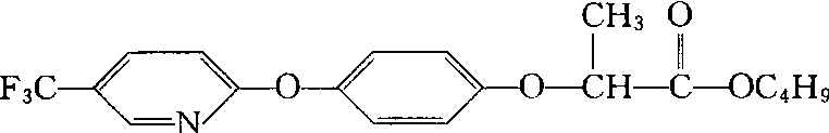 氟草除fluazifopbutyl又称稳杀得、吡氟禾草灵。苯氧基类选择性茎叶处理除草剂。化学名称:2-〔4-(5-三氟甲基-2-吡啶氧基)苯氧基〕丙酸丁酯。化学结构式如下。原药为淡黄色无臭液体,沸点170℃/66.7 Pa,20℃时蒸气压为733.3×10-5Pa,几乎不溶于水,可溶于丙酮、环己酮、甲醇、二甲苯、二甲烷等溶剂。具有内吸和传导活性,可通过茎、叶和根吸收,进入植物体内水解成酸,传导到生长点及节的分生组织,干扰植物ATP的产生和传递,破坏光合作用;抑制禾本科杂草节和根茎的细胞分裂,使逐渐枯死。仅对一年生及多年生禾本科杂草有效。适用于棉花、大豆、花生、油菜、豆类、瓜类、蔬菜、烟、麻等阔叶作物田防除一年生禾本科杂草。对人、畜低毒,大鼠急性口服LD50为3 300 mg/kg,兔急性经皮LD50>2 420 mg/kg。