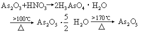 2FeAsS+5O2=Fe2O3+2SO2+As2O3 五氧化二砷又称砷酐,是无色单斜晶体或白色无定形粉末,有剧毒! 相对密度为4.15,熔点为193℃,沸点为457.2℃,312℃时升华,315℃时分解。易潮解,极易溶于水,20℃时溶解度为230,溶于水成砷酸,这是个三元中强酸(18℃时,K1=5.62×10-3,K2=1.70×10-7,K3=3.95×10-12)。五氧化二砷高温下可分解为三氧化二砷和氧。它是个弱氧化剂,可将二氧化硫氧化成三氧化硫: As2O5+2SO2=As2O3+2SO3 五氧化二砷常用来制备砷酸盐、杀虫剂以及在染料和印刷工业上应用。将浓硝酸与三氧化二砷共同加热,浓缩后冷却则有水合砷酸H3AsO4·H2O晶体析出,再加热即可得白色玻璃状的五氧化二砷,过程如下: ☚ 砷 硫化砷 ☛ |