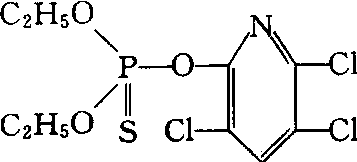 释义 | 氯吡磷chlorpyrifos又名乐斯本、毒死蜱、Dursban、Dowco179、Lorsban、Brodan。广谱性有机磷杀虫、杀螨剂。化学名称:O,O-二乙基-O-(3,5,6-三氯-2-吡啶基)硫逐磷酸酯。化学结构式如下。工业纯品为无色粒状晶体,熔点42~43.5℃,25℃时蒸气压2.5 mPa、25℃时水中溶解度2 mg/L、丙酮6.5 kg/kg、苯7.9 kg/kg、氯仿6.3 kg/kg、甲醇450 g/kg。在水中随pH值及温度增加而水解也加快,室内pH8及25℃水解50%1.5天。主要是触杀和胃毒杀虫作用兼有熏蒸作用无内吸作用。可以防治麦蚜、稻飞虱、稻叶蝉、蓟马、稻纵卷叶螟、棉铃虫、棉红铃虫、菜青虫、黏虫、柑橘潜叶蛾、山楂叶螨、棉叶螨等。急性口服LD50大鼠为135~163 mg/kg、豚鼠为500 mg/kg、小鸡为32 mg/kg、兔为1 000~2 000 mg/kg。经皮LD50兔为2 000 mg/kg,2年饲喂试验无作用剂量(NEL),大鼠0.03mg/(kg·d)、狗0.01 mg/(kg·d)。鱼毒LC50鲤(48 h) 0.13mg/kg属高毒。 |