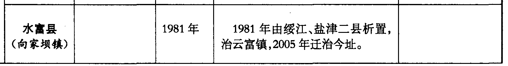 水富县(向家坝镇)1981年1981年由绥江、盐津二县析置,治云富镇,2005年迁治今址。