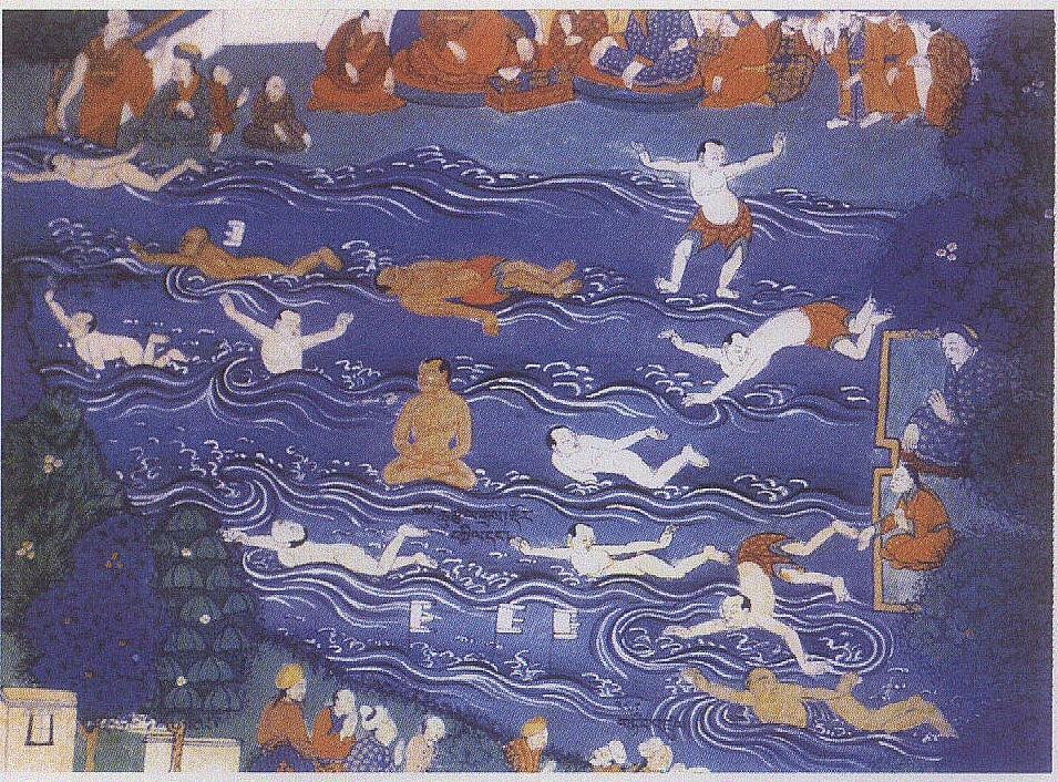 水戏shuixi中国古代水上运动。又称“水嬉”。主要包括游泳和龙舟竞渡等水上运动形式。源于原始人类的渔猎生产活动。在历史的发展过程中,由于军事上的需要,提高了水上运动的技术水平; 而与民间节日活动的紧密结合,又丰富了水上运动的形式,因而是具有民族特色的传统体育的重要组成部分。较重要的游泳图壁画有甘肃省敦煌莫高窟第257窟北魏(386~534)时代的游泳图壁画,这幅壁画的水池中,4个游泳者出没起伏于莲花之间,游泳者动作舒展有力; 第420窟的隋朝 (581~618)的游泳图壁画,这幅壁画表现了一群活泼健美、生气勃勃的习水善泅者的形象。西藏拉萨市布达拉宫里清朝(1644~1911)的游泳图壁画,画面描绘了习水游泳者的各种姿态。主要记载龙舟竞渡水上运动的有1976年浙江省鄞县出土的春秋时期(公元前770~前475)的龙舟竞渡纹铜钺,铜钺一面的纹饰中,上部刻有双龙图案,下部为一组头插羽饰的划船者。1976年广西贵县罗泊湾出土的西汉(公元前206~公元25)时期的龙舟竞渡纹铜鼓,画面描绘了鼓胸有羽人划船纹6组,每组5、6人。台北故宫博物院里的《龙池竞渡图》卷局部再现了北宋崇宁年间3月3 日由皇家在金明池举办龙舟竞渡的宏大场面。