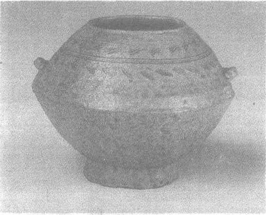 西周。高13.2厘米,口径8.4厘米。河南省洛阳出土。北京故宫博物院藏。这是一件造型特别的作品。敛口,口沿至腹部斜度较大,下腹至罐底又急剧内收,配以外撇的短圈足,整个器形像两只扣放的大碗,具有中原地区浑厚粗犷的风格。釉呈米黄色,肩部安两横系,饰弦纹一组,弦纹上下各饰水波纹一周。西周原始青瓷器除在河南洛阳、浚县出土,安徽屯溪墓葬中亦发现较多。两地器物釉色明显不同。屯溪出土物颜色较深,青中带褐。洛阳出土物则青中泛黄,呈色较浅。此器物显示的是洛阳西周原始瓷的典型釉色。原始瓷见“青褐釉原始瓷尊”条目。