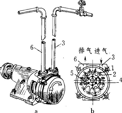 释义 | 水环式真空泵waterring vaccumpump靠偏心安装的星形叶轮旋转时形成的水环进行抽气、形成真空的水力机械。依靠偏心安装的叶轮旋转,把机械能传递给工作液体,形成水环。水环与叶片间的空腔的容积发生周期性的变化,使气体周期性地降低或升高,致使空气不断被吸入或排出。大、中型水泵站常用真空泵排除水泵进水管和泵壳内的空气,形成水泵吸水的初始条件,使水泵运行。 真空泵外形与构造 a.外形 b. 剖面 1.叶轮 2. 水环 3. 进气管 4.进气口 5.排气口 6.排气管 水环式真空泵利用偏心安装的叶轮和旋转液环改变工作容积而抽排气体的一种泵,是真空泵的一种。 |