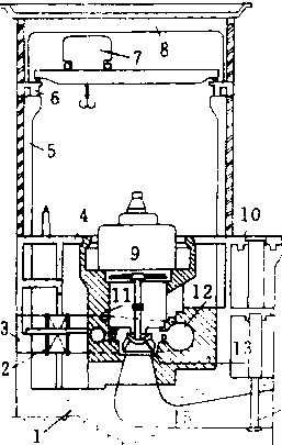 水电站厂房横剖面 1.基础底板 2. 水轮机阀门 3.侧墙 4. 发电机层楼板 5.构架柱 6. 吊车梁 7. 桥式起重机 8.屋顶大梁 9. 发电机 10. 尾水平台 11. 机墩 12. 蜗壳 13. 水轮机转轮 14. 尾水闸水槽 15.尾水管 水电站厂房水力发电建筑物的中心,是将水能转化成电能的生产场所,水(水工)机(机械)电(电气)的综合体。要求通过工程措施,合理布置各种主辅设备(机、电),以便于施工、安装、检修、运行及管理。 |