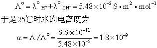 释义 | 水的离子积 水的离子积shui de liziji水是一种极弱的电解质,产生微弱的电离: 式中K——水的电离平衡常数。因电离极少,水的浓度〔H2O〕可视为常数。上式中〔H+〕〔OH-〕亦可视为常数,令它为Kw,则: Kw称为水的离子积。 因一般蒸馏水中溶有空气中的CO2等物质,其电导率值约为10-2~10-3S·m-1。F.W.G.柯尔劳施在25℃时测定极纯的水的电导率,得 k=0.055×10-4 S·m-1 又1mol纯水的体积为1.802×10-5m3,则水的摩尔电导率为 由表查得水完全电离时的摩尔电导率为 又1 L水的质量可近似为1000g,水的摩尔质量为18.02g,1L水中水的物质的量浓度为1000/18.02=55.5mol·L-1 则〔H+〕=〔OH-〕 =cα=55.5×1.8×10-9 =1.0×10-7 mol·L-1 故 Kw= 〔H+〕 〔OH-〕 =1.0×10-14 mol2·L2 水的离子积只受温度的影响,温度升高,Kw值增大 (见下表)。 水的离子积 mol2·L-2