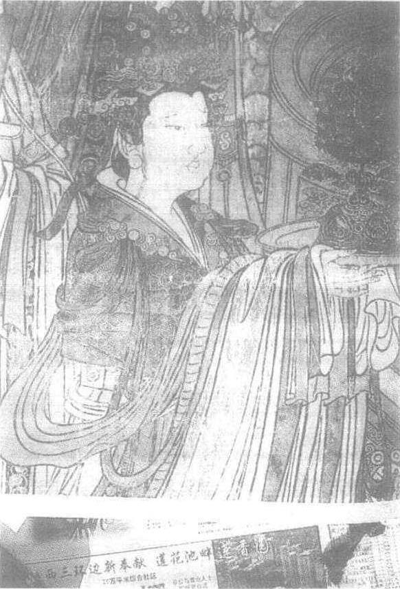 此飞天是三清殿内的一件作品,飞天为女像,身穿道服,彩带飘舞,在滚滚彩云的烘托下,凌空飞舞。衣纹线条极富韵律感。