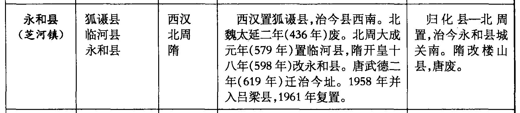 永和县(芝河镇)狐县临河县永和县西汉北周隋西汉置狐县,治今县西南。 北魏太延二年(436年)废。北周大成元年(579年)置临河县,隋开皇十八年(598年)改永和县。唐武德二年(619年)迁治今址。1958年并入吕梁县,1961年复置。归化县—北周置,治今永和县城关南。隋改楼山县,唐废。