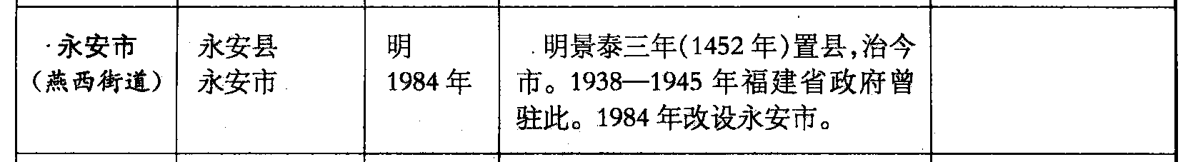 永安市(燕西街道)永安县永安市明1984年明景泰三年(1452年)置县,治今市。1938—1945年福建省政府曾驻此。1984年改设永安市。