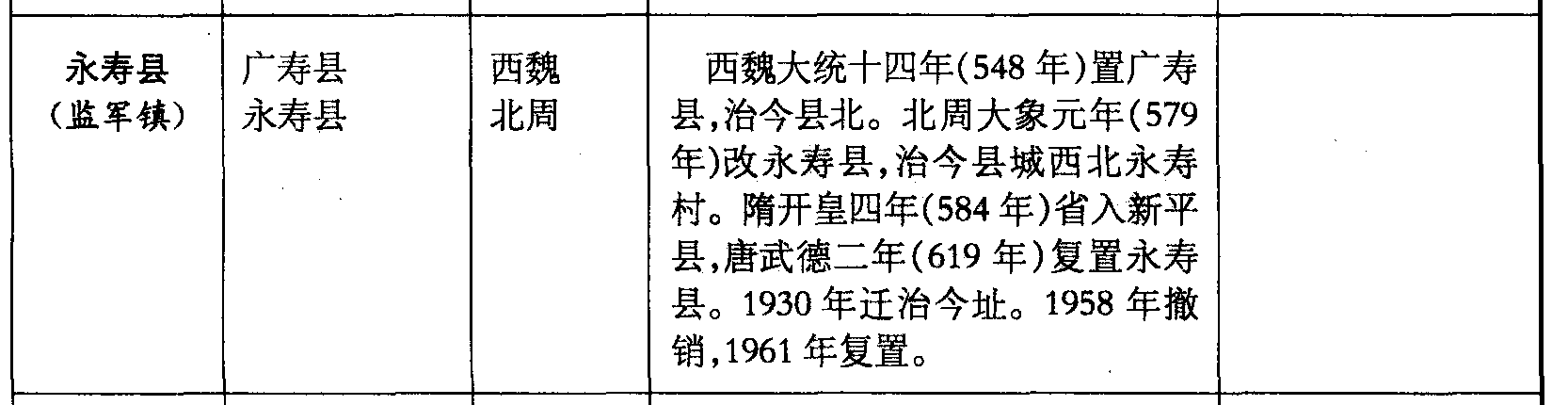 永寿县(监军镇)广寿县永寿县西魏北周西魏大统十四年(548年)置广寿县,治今县北。北周大象元年(579年)改永寿县,治今县城西北永寿村。隋开皇四年(584年)省入新平县,唐武德二年(619年)复置永寿县。1930年迁治今址。1958年撤销,1961年复置。