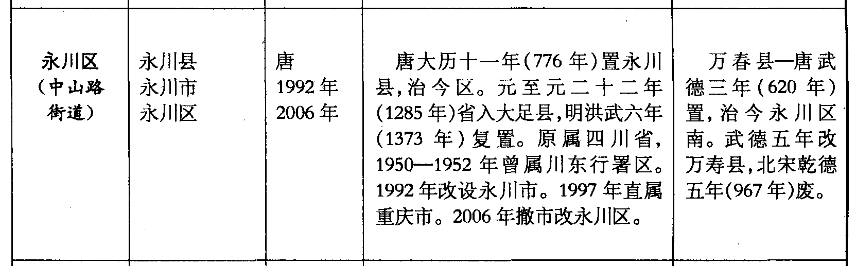 永川区(中山路街道)永川县永川市永川区唐1992年2006年唐大历十一年(776年)置永川县,治今区。元至元二十二年(1285年)省入大足县,明洪武六年(1373年)复置。原属四川省,1950—1952年曾属川东行署区。1992年改设永川市。1997年直属重庆市。2006年撤市改永川区。万春县—唐武德三年(620年)置,治今永川区南。武德五年改万寿县,北宋乾德五年(967年)废。