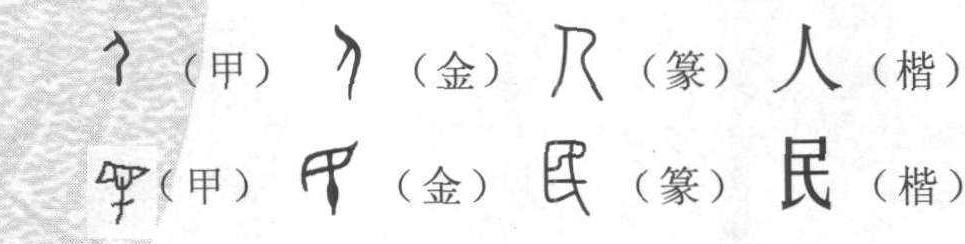 甲骨文的“人”取象于人的侧面全身,从头到脚,一笔流线勾勒,把人类幼年的稚体和优美的曲线展现得活活脱脱。复杂的人体走入造字者的想象之中,就成了凝炼、质朴、抽象的线条。它折射出的是祖先智者观察与把握事物的细密与准确。 人的生命是宇宙物质生命的一部分。“无名,天地之始; 有名,万物之母” (老子 《道德经》)。宇宙自然赋予人以意识能力,人开始把自身同外在的自然物区别开来,必然在关注外在世界的同时关注自身。中华先民创造的最先符号之一大概就是“人”。“人” 自造出,对所有人都不陌生,且有相当的亲和力,不是吗?至今连学龄前儿童也能闭着眼画出个 “人” 来。甲骨文的“人”,具有明显的美学意义。仅以两条曲线展现给我们的是一个侧身向左站立、腰身稍有前趋的人形。金文和小篆的“人”,形体上都保留了这种简洁明快的曲线风韵。直立的身躯,表明他与地平线已经形成垂直状态,目光从此可以远视,脚与手从此分工; 身躯顶部有着能够思前想后的发达头脑; 前趋微驼的脊梁,表明生存的负重与生命历程的艰涩; 灵活劳作能够制造和使用工具的双手、朝前的胸腹、宽阔的双肩、着地而高跷的脚趾,就决定了他最终将是这个星球的建设者,护卫者。 有人说,楷书 “人” 的一撇一捺,是人性的抽象,一撇好比人的自然属性,一捺好比人的社会属性,自然属性靠着社会属性的支撑,把“人”才树立起来。还有人说,一撇是你,一捺是我,我靠着你,你依着我,是天然的不解缘分,才使得 “人”撑出一天穹隆。又有人说,从几何与力学的角度讲,一撇是他,一捺是她,互相支持、紧紧相依、互不脱离,才有“人” 下那牢牢的一片温馨空间。 人是最复杂的,复杂得一个人就是一个世界;而“人”却是最简单的“近诸其身”的字,简单得只有一撇一捺。“人”既是对人体的高度概括,又反映了原始人认识自己、描摹世界的淳朴心态。 有人说: “人者天与阴阳三合而生,故为三歧,上一而下二”,这附会于楷书 “人” 的形状,并不适合对于甲骨文、金文和小篆的形释。而对于人的来历、人与自然的关系,却不失为精当之论。 人是自然界赐予的一种特殊的生命形态。人是自然的,自然的人就被哲学家、生物学家们称之为完全生物意义上的人。但是,每个人只有在一定的社会关系中才是现实的、真正意义上的人。换句话说,每个人只有在一定的社会关系中才能实现真正意义上的人。《礼记·礼运》: “故人者,其天地之德,阴阳之交,鬼神之会,五行之秀气也。”人其所以为万物之精灵,按古人的解释,他是采天地日月之精华,集阴阳五行之毓秀,在宇宙万物之中经亿万年历史之进化而形成的。人的终身使命是学着做人。 人在漫长的进化过程中,虽是从苦难中前仆后继、风刀霜剑一路走来,但还不像“民”那样惨烈。“民”是被殷商奴隶主贵族活活剜去一只眼睛的人,在那时“民”是苦难的代名词。看一看甲骨文“民”字的形状就可知道。 甲骨文的“民” ( ), 是个带有象形韵味的会意字。 像人的一只左眼, 被甲骨文 “��” 刺插的形状。“��”, 音哲 (隶变后楷书写作 “乇”, 形似匕首),“��”作为动词是古代祭祀时割裂牲体; 作为名词是割裂牲体的一种工具。民字的组构为我们提供的信息是: 用割裂牲体的一种工具“��”, 剜掉人的一只左眼。 “民”是奴隶队伍中的强硬派,是殷商末期统治者的心腹之患,广大奴隶与奴隶主贵族之间的阶级矛盾异常尖锐。方国反叛、奴隶暴动屡屡发生,殷商王朝便用剜去或刺伤一只眼睛来区别俘虏的奴隶。被剜去眼睛的奴隶数量逐渐增多,便形成了一个属于这个阶层或阶级的“ 民 ”。 对于“民”,郭沫若有一段论述: 周金文民字“均作一左目形而有刃物以刺之”,“以之为奴隶之总称。且周文有民字而殷文无之,疑民人之制实始于周人。周人初以敌囚为民时,乃盲其左目以为奴征注①。臣民字均用目形为之。臣目竖而民目横,臣目明而民目盲。此乃对于俘虏之差别待遇。……其愚戆而暴戾者,初则杀戮之,或以之为人牲,继进则利用其生产价值,盲其一目以服苦役,因而命之曰民。” “民”,殷墟卜辞用作罪隶、人牲,他们充当卯、尞、沉、御、埋等祭坛上一堆血肉。卜辞“卯民其奠王…。”、“其奠王卯民。”卯也具有裂杀的意思,是说用被剜去一只眼睛的罪奴作人牲,来祭祀商王亡灵。也用作盲隶,“王役…民…。” 是说商王驱使失去左眼的盲人做苦役。“卯民奠王次”,是说以“民”作为牺牲给商王出师作奠行之祭 。 金文的 “民” ( ), 更加形象: 省去了眼珠形状, 将“��” 的一横讹变成一小黑点, 成为有眼无珠,眼珠掉落之状,或为“白眼”状。(白眼表示仇视、怨恨、暴怒、嫉恨,与“青睐”相反) 其原有的含意不变。 小篆的 “民” ( ), 由象形向书写的文字化发展,将左眼眼角线拉长,使眼睛的形状失真;将金文的一小黑点拉长变作一横。楷书的“民”,是更加文字化的结果 。 民的本意是被剜去或刺伤一只左眼的奴隶,商代末期,“民”、“蒙”、“氓”、“盲”、“萌”义相通,民也称萌,故《说文》:“民,众萌也”。《左传·定公四年》:“昔武王克商,分鲁公以殷民六族。”这里的“殷民”系指原殷商贵族的奴隶。 “民” 的出身不好,从“民”所组构的汉字也无不带有贬义,如苠、氓、眠、抿、愍等