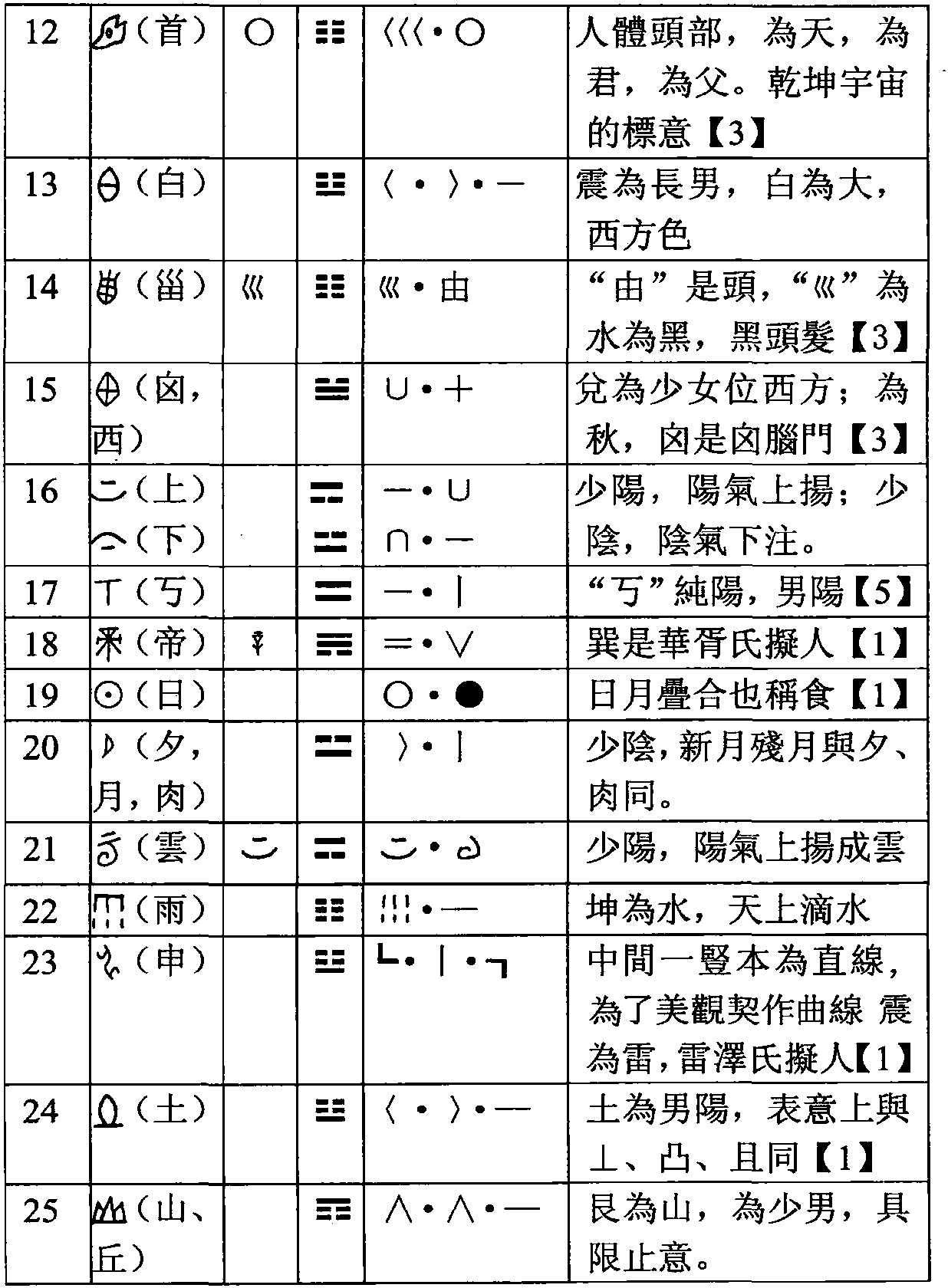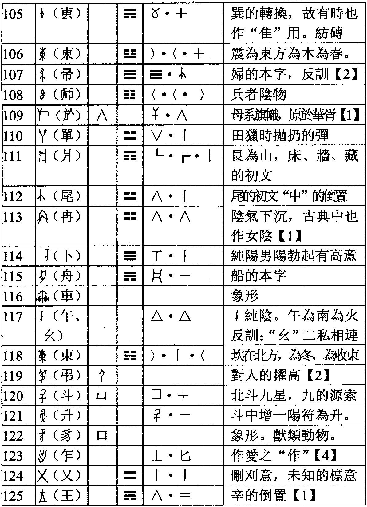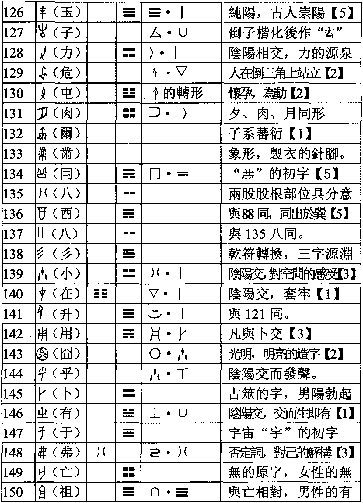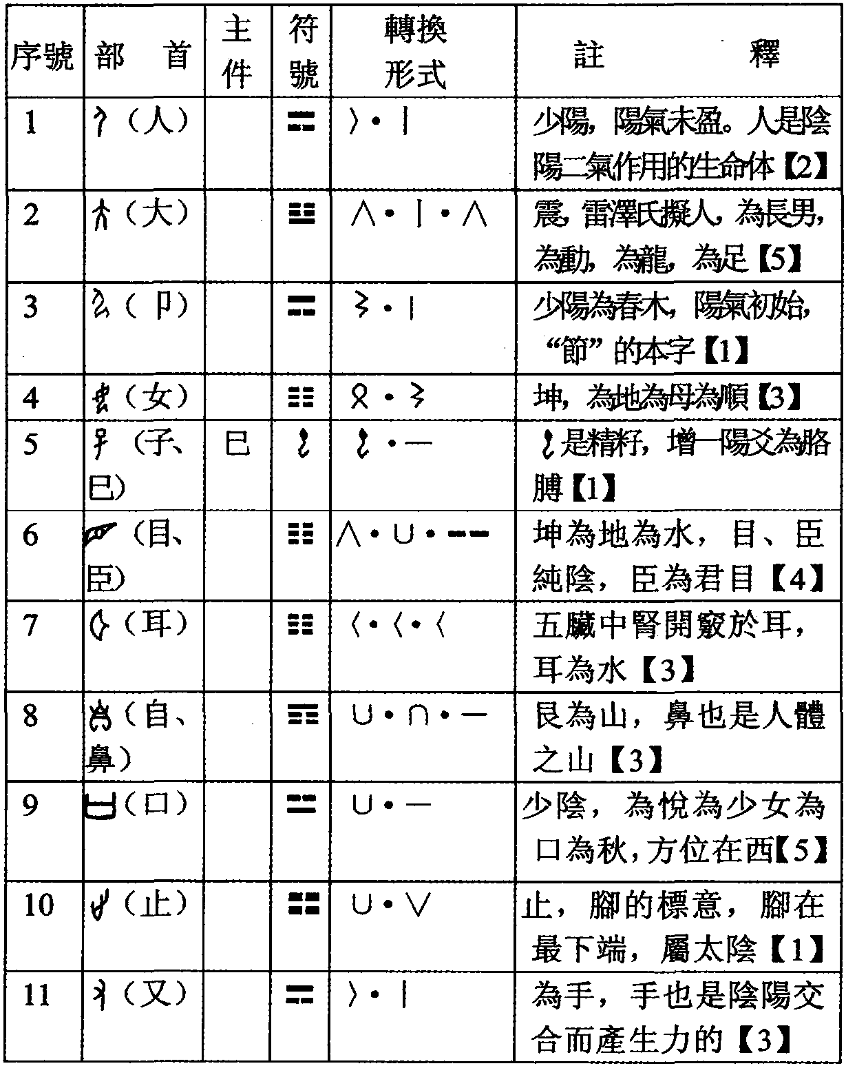 甲骨文字部首与八卦符号转換 (僅按于省吾主編《甲骨文字詁林》150個部首) 甲骨文不是象形文字。 “五四”運動以前,所有的文字大家們沒有一個人說過中國的文字是象形文字。他們所說的“象形”是指“在天為象,在地為形”的象形。是指古人仰觀天於象,俯察地於形,造出了文字。並非現代語文界所說的“象形文字”。“象形文字說”是“十月革命”炮聲中的一股硝煙,其中不免夾裹著文字大佬的臆測和武斷。須知中國自“五四”以來,以革命的名義造就文字釋解境域乃至文化、政治領域中的謬誤實在太多了! 呆在文字釋解顯像屏前的大佬們,也該換一換頻道了。 “象形說”可以休矣! 由著名古文字學家于省吾先生主編的《甲骨文字詁林》一書中,對大約4600多個甲骨文字形,歸納為150個部首。這150個部首中,除個別部首出於象形外,其餘的構形基本上都是由八卦符號轉換、異構而來的。為了明晰起見,以列表的形式來向讀者述訴。