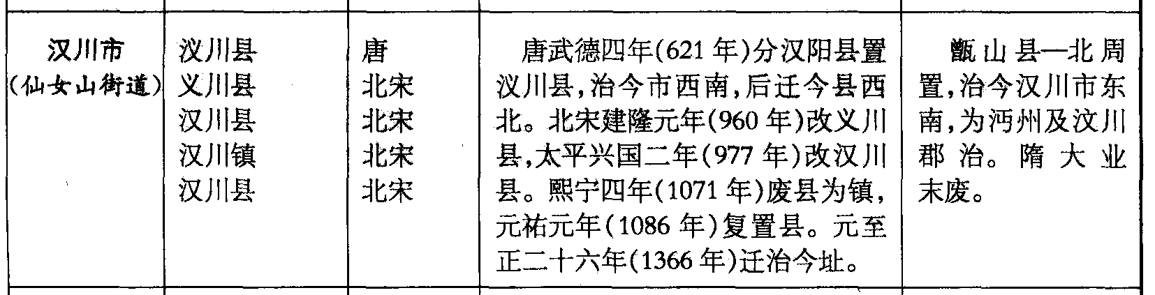 汉川市(仙女山街道)川县义川县汉川县汉川镇汉川县唐北宋北宋北宋北宋唐武德四年(621年)分汉阳县置川县,治今市西南,后迁今县西北。北宋建隆元年(960年)改义川县,太平兴国二年(977年)改汉川县。熙宁四年(1071年)废县为镇,元祐元年(1086年)复置县。元至正二十六年(1366年)迁治今址。甑山县—北周置,治今汉川市东南,为沔州及汶川郡治。隋大业末废。