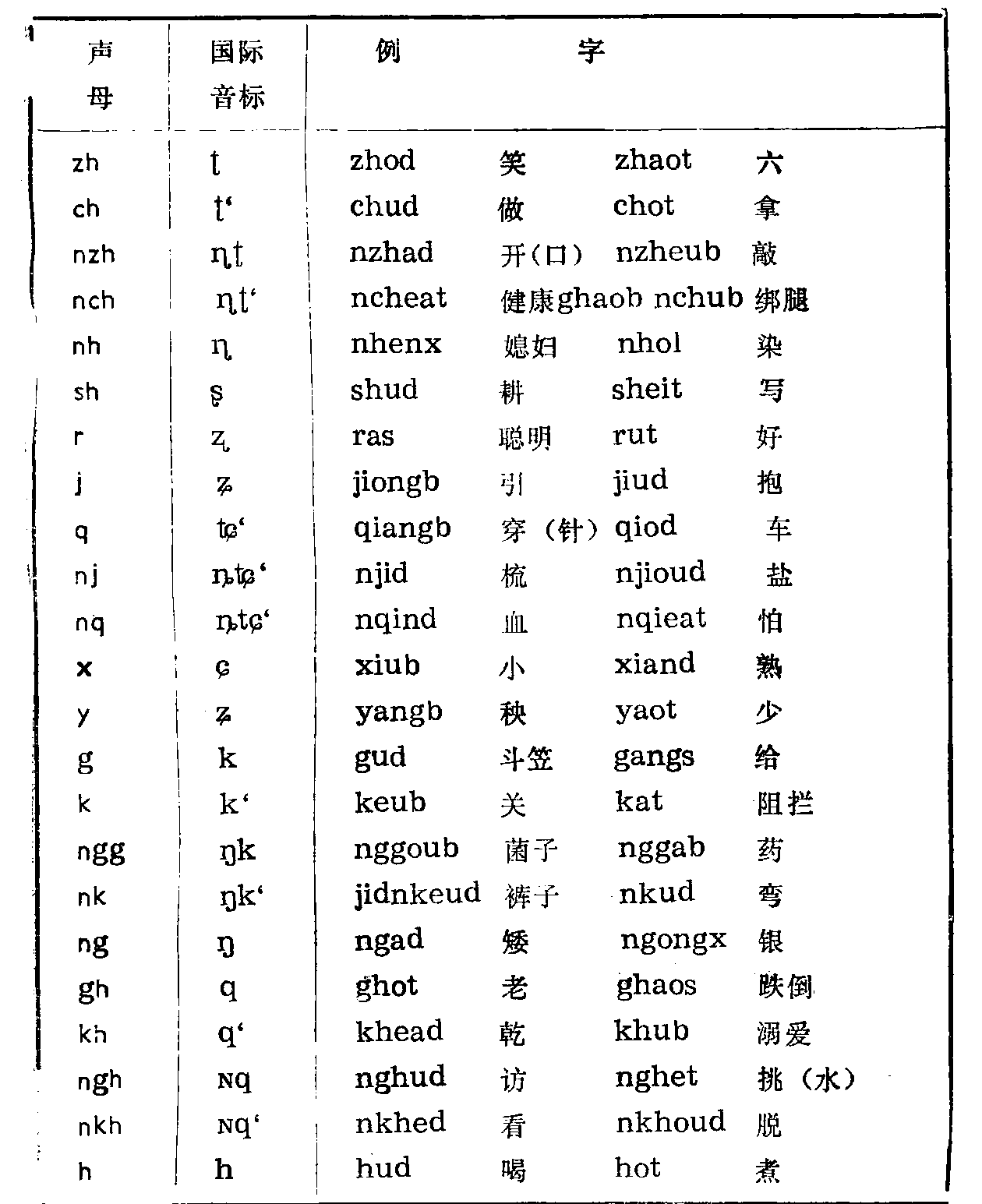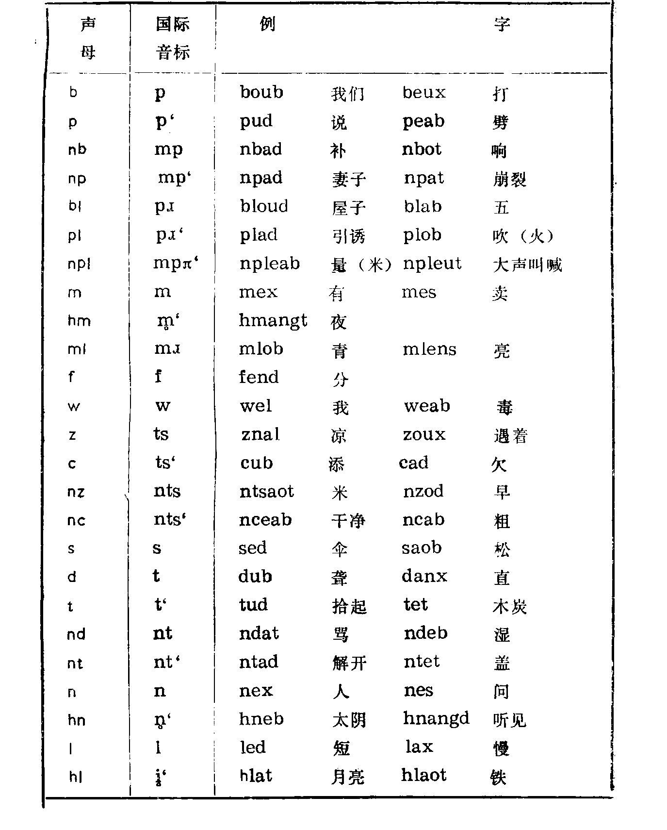 附注: (1) b c d f g h j k l m n p q r s t v w x y z是子音) 字母; a e i o u是母音字母。 (2) v只用来拼写借词。 四、声母 苗文共有四十八个声母。 下面列出声母表。