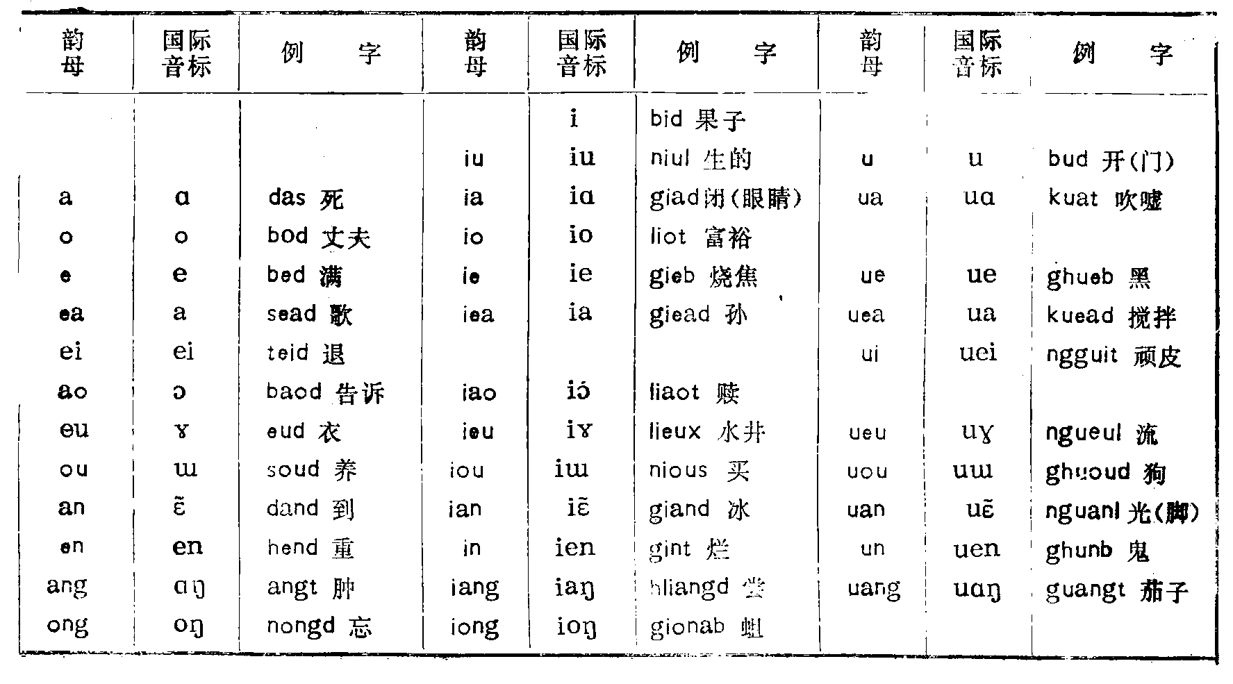附注: 声母 j q nj x只能与i行的韵母相拼。 五、韵母 苗文共有三十五个韵母。下面列出韵母表。