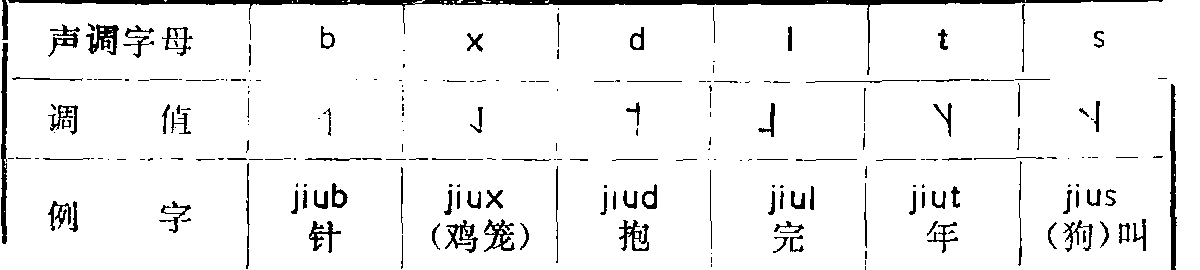 附注: 1.当韵母i接在声母z c nz s后面时读成 〔 〕; 接在声母zhch sh nzh rch sh nzh r后面时读成 〔 〕。 2.i行韵母除i外都不与声母y相拼。 六、声调 苗文有六个声调分别用六个子音字母作声调字母。 声调字母写在韵母的后面。 下面列出声调表。