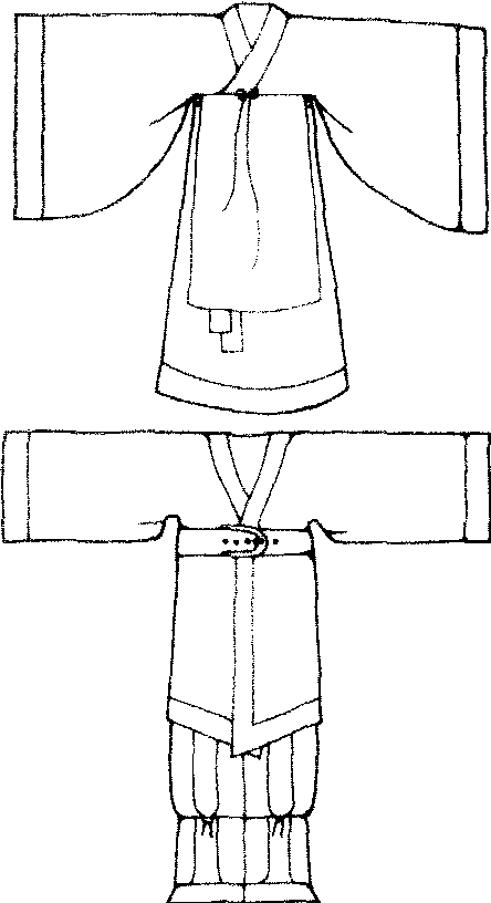 释义 | 汉魏服饰 汉魏服饰han wei fushi两汉时期,国家统一,各项典章制度, 包括服饰制度日益完备。汉孝明帝永平二年(59)制定了汉代朝服制及有关祭祀礼仪服饰,包括冠冕、衣裳、鞋履及佩饰等。 冠 衣裳的 “衣”字狭义特指上衣。汉朝时上衣种类有单、夹, 长、短之分。袍——里面絮麻或丝棉的夹衣, 为汉代男子服装。汉朝400年间, 袍服一直被当作礼服。袍服样式以大袖为多,袖口部分却收缩紧小。《尔雅·释衣》称袖口紧窄部分为 “祛”, 袖身宽大部分为“袂”。袍服的领和袖,一般都用花边装饰。禅衣——即单衣。形制与袍略同, 只是不用衬里, 平时在家穿著,上朝时,可穿到朝服里面,一般不穿着在外。襦——指短上衣。长度一般只到腰间,穿时多配裙子。襦裙是汉代妇女的常服,也是中国妇女服饰中的一科主要样式,历经两千年之久。古代上衣的领子有两种:交领和直领。交领的衣领直联左右襟,衣襟在胸前相交,左襟压右襟,在右腋下挽结,领子也随之相交。直领是领子从颈后沿左右绕到胸前,平行地直垂下来。古人上衣外面要系带:分有大带、革带。大带束衣,革带上拴有佩物,然后再系到大带上。大带通常用丝制成。所谓金带、玉带,都是在丝带上饰以金、玉。 袍 古代“裳” 一般泛指下衣,狭义指裙。古代男女服装区别不大,男子也著裙服。袴——即今之“裤”字,但其形制和现在的裤子很不一样。古代“袴”没有前后裆,只有两个裤筒,套在膝部,用带子系于腰间,类似现在的套裤。用纨(织造细致的绢)制作的袴为有钱人所穿著,后来,“纨袴”一词专指富贵而不务正业者。如“纨袴子弟”。褌(kun昆),和现在的裤子差不多,是一种有裆之裤。还有一种合裆短裤,因其形似犊鼻又名“犊鼻褌”,类似后代的短裤、裤衩。蔽膝——这是遮住大腿至膝部的服饰,与今天的围裙有些相似,所不同的是蔽膝较窄,较长,它并不象围裙那样直接系到腰上,而是拴到大带上,其功用主要不是保护衣服,而是一种装饰。 汉代鞋履有屦(ju巨)、履、舄(xi戏)、屐、鞮等名目。屦、履——用草、麻、皮、丝均可制作。汉以前称为屦,汉以后则称履。用草编制叫“草屦”,葛藤加工制成叫“葛屦”。舄——是在鞋底子下面加一层木板,很象现在加钉一层鞋掌。有时也用舄泛指各种类的鞋。屐,是木鞋,有前、后二齿。《后汉书·五行志》记载,汉代妇女出嫁时,穿木屐,屐上绘彩画,并以五彩丝带系之。鞮,是一种皮鞋。古代也有皮靴,写作“鞾”,主要是从北方少数民族地区传入。古人的袜 子多用布帛、熟皮制作,穿袜子时要用带子系上,富贵人家穿丝质袜子。 古代佩饰中较常见的是玉佩,种类很多。环,是环形玉,当中的空心直径与四周玉的宽度相等。玦,即环缺了一块。璜,是半环形的玉。容刀,也是一种佩饰,佩在带上,即佩刀。人们最初佩带刀是为自卫防身,但后来发展成为一种仪容,有刀形而无刃,纯为“样子货”。汉代特许大臣带剑上殿成为一种难得的荣耀。《史记·萧相国世家》:“于是乃令萧何(功)第一,赐带剑、履上殿,入朝不趋。”佩饰中还有佩巾,称为帨(shui税)。它既是装饰品又是日常用品,可用来拭手、去垢。古人佩饰有多种,而且随时代变化而增损变更。 魏晋时期的法制服饰基本上承袭秦汉旧制。南北朝,少数民族入主中原,受到汉族文化影响,太和八年(494)北魏孝文帝改革,规定:“群臣皆服汉魏衣冠。”汉族传统的服饰被保存下来。同时,各民族长期杂居,南北生活习俗趋于融合,汉服也吸收了北方少数民族服饰特点,更加称身合体,中原地区出现胡服盛行局面。幅巾——魏晋南北朝时,幅巾束首,是主要头服。苏轼《念奴娇》词:“羽扇纶巾,谈笑间,樯灰飞烟灭。”羽扇纶巾,是三国时代儒将的装束。纶巾,为汉代幅巾的一种,一般认为以丝带织成。因传说为诸葛亮服用,故又名“诸葛巾”。幅巾束首,即不戴冠帽,只以一块帛巾束首,始于东汉后期。东汉末年的“黄巾起义”就是以黄巾束首为标志。《晋书》记载,汉末王公名士“以幅巾为雅”,这种厌弃冠冕公服,以幅巾束首的风气一直延续到魏晋,仍十分流行。衫——大袖宽衫是魏晋南北朝时汉族的主要服装。衫与汉朝袍的区别是袖端不收敛,不受衣袴的限制,袖口特别宽敞。有单、夹两种。当时上自王公,下至百姓,都以大袖宽衫为时尚,尤其受魏晋佛教、玄学及道教影响,文人突破了旧的礼教,服饰的穿著趋向宽大,并有袒胸露脯的习俗。袴褶(zhe者),是由缚袴和褶衣所组成的服饰。虽出现于汉末,但早在战国时代就是赵武灵王引进的胡服之一。汉魏之际主要在军旅中穿着。魏晋以后,被广泛用于民间,同时也仍是军将武士的戎装。其特点:衣身紧而窄小,长与膝齐;袴管宽松,下长至足。袴褶束腰一般多用皮带,贵重的皮带镂饰金银,袴管的膝盖处,用锦缎丝带系扎,以便行动。袴褶的质料可用布缣锦缎,也有用野兽毛皮制作,这主要用于官员临戎戒严和狩猎出征。裲裆——与背心形制相似。《释名·释衣服》称裲裆“其一当胸,其一当背也”。分前后两片,质地主要是布帛,肩部以皮制褡襻联缀,腰间用皮带系扎。有的裲裆之内,还纳有丝棉,是后代“棉背心”的最早形式。裲裆虽为男子服饰,但当时妇女也可服用,只是最初多穿在里面,以后才将它穿在交领衫袄之外。也有妇女在穿著裲裆的同时穿著 褶的,但这种装束主要在北方,并且妇女头上往往