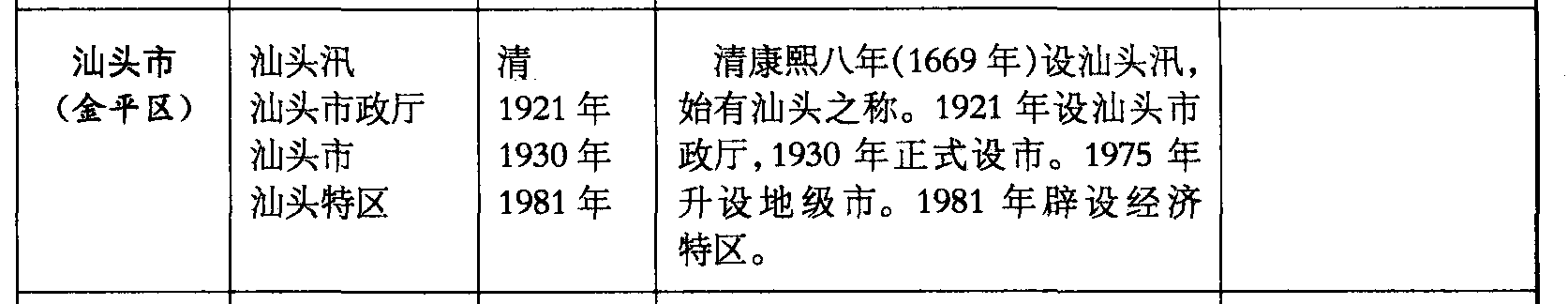 汕头市(金平区)汕头汛汕头市政厅汕头市汕头特区清1921年1930年1981年清康熙八年(1669年)设汕头汛,始有汕头之称。1921年设汕头市政厅,1930年正式设市。1975年升设地级市。1981年辟设经济特区。