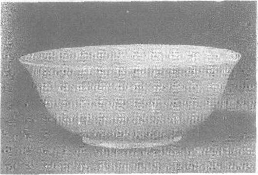北宋。高6.7厘米,口径17.1厘米。北京故宫博物院藏。此碗侈口,圈足外撇,器形端正秀美。器内外均施淡青色釉,细碎的片纹隐露于釉面,宛如秋日的晴空飘浮着几缕白云。器底有5个支钉痕,是烧瓷器时留下的印迹。汝窑使用支钉是受五代和北宋时期岳州窑的启发,但所用支钉细小,俗称“芝麻钉”。碗底刻有乾隆丁酉年(公元1777年)的御题诗文,是清宫藏瓷的精品。汝窑见“‘寿成殿皇后阁’汝窑青釉瓷盘”条目。