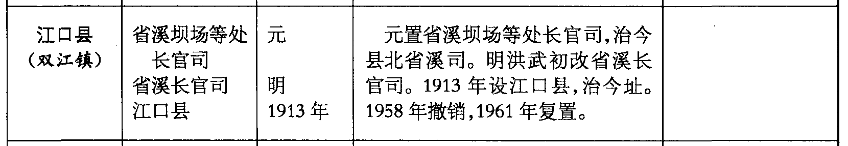 江口县(双江镇)省溪坝场等处长官司省溪长官司江口县元明1913年元置省溪坝场等处长官司,治今县北省溪司。明洪武初改省溪长官司。1913年设江口县,治今址。1958年撤销,1961年复置。