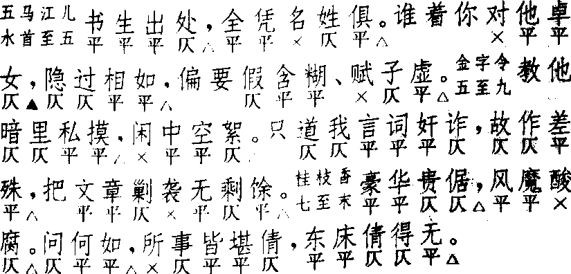 | 释义 | 江头金桂 江头金桂吴炳 《绿牡丹》 ![]() 全曲十五句:4△,5△。4▲,4△,6△。4△,4△。6,4△,7△。4△,4△。3△,5,5△。第十一句可多增一叠句,如《琵琶记·瞷询衷情》、《香囊记·分岐》、《鸣凤记·南浦分别》、《红拂记·奉征高丽》都是。末二句有作七字句者,如《红拂记·奉征高丽》、《金雀记·临任》。〔江头金桂〕叠四支成套,亦有叠二支者,单用一支较少。小令兼用。 ☚ 二犯江儿水 风云会四朝元 ☛ |
