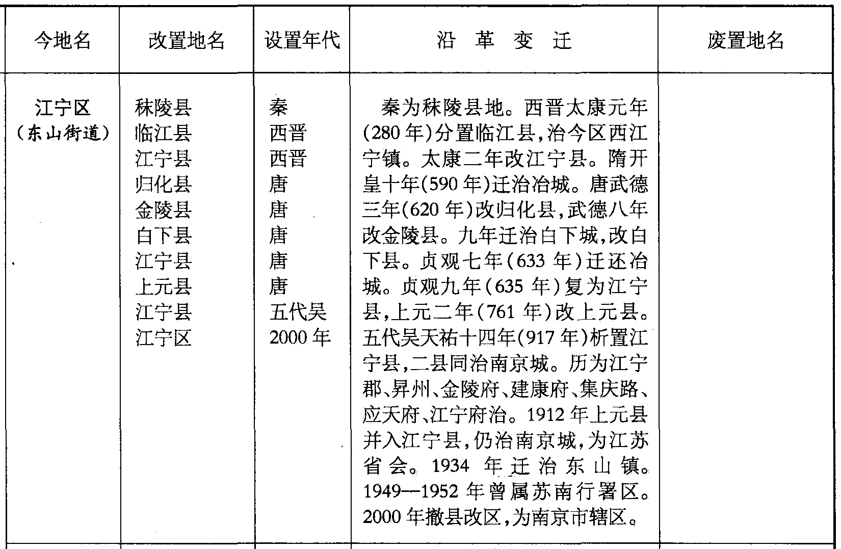秦为秣陵县地。西晋太康元年(280年)分置临江县,治今区西江宁镇。太康二年改江宁县。隋开皇十年(590年)迁治冶城。唐武德三年(620年)改归化县,武德八年改金陵县。九年迁治白下城,改白下县。贞观七年(633年)迁还冶城。贞观九年(635年)复为江宁县,上元二年(761年)改上元县。五代吴天祐十四年(917年)析置江宁县,二县同治南京城。历为江宁郡、昇州、金陵府、建康府、集庆路、应天府、江宁府治。1912年上元县并入江宁县,仍治南京城,为江苏省会。1934年迁治东山镇。1949—1952年曾属苏南行署区。2000年撤县改区,为南京市辖区。