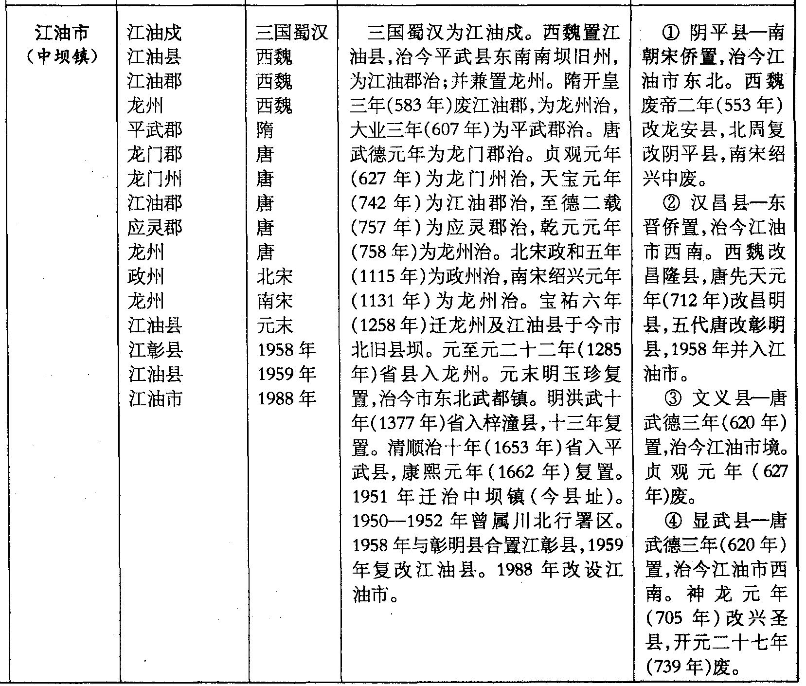 三国蜀汉为江油戍。西魏置江油县,治今平武县东南南坝旧州,为江油郡治;并兼置龙州。隋开皇三年(583年)废江油郡,为龙州治,大业三年(607年)为平武郡治。唐武德元年为龙门郡治。贞观元年(627年)为龙门州治,天宝元年(742年)为江油郡治,至德二载(757年)为应灵郡治,乾元元年(758年)为龙州治。北宋政和五年(1115年)为政州治,南宋绍兴元年(1131年)为龙州治。宝祐六年(1258年)迁龙州及江油县于今市北旧县坝。元至元二十二年(1285年)省县入龙州。元末明玉珍复置,治今市东北武都镇。明洪武十年(1377年)省入梓潼县,十三年复置。清顺治十年(1653年)省入平武县,康熙元年(1662年)复置。1951年迁治中坝镇(今县址)。1950—1952年曾属川北行署区。1958年与彰明县合置江彰县,1959年复改江油县。1988年改设江油市。