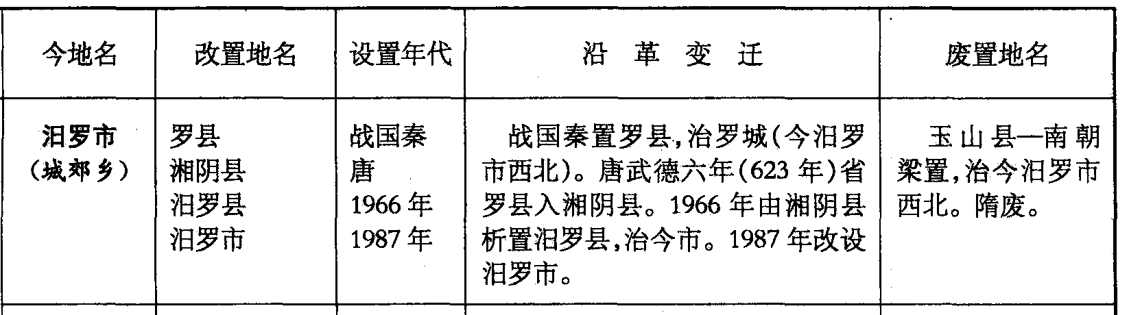 汨罗市(城郊乡)罗县湘阴县汨罗县汨罗市战国秦唐1966年1987年战国秦置罗县,治罗城(今汨罗市西北)。唐武德六年(623年)省罗县入湘阴县。1966年由湘阴县析置汨罗县,治今市。1987年改设汨罗市。玉山县—南朝梁置,治今汨罗市西北。隋废。