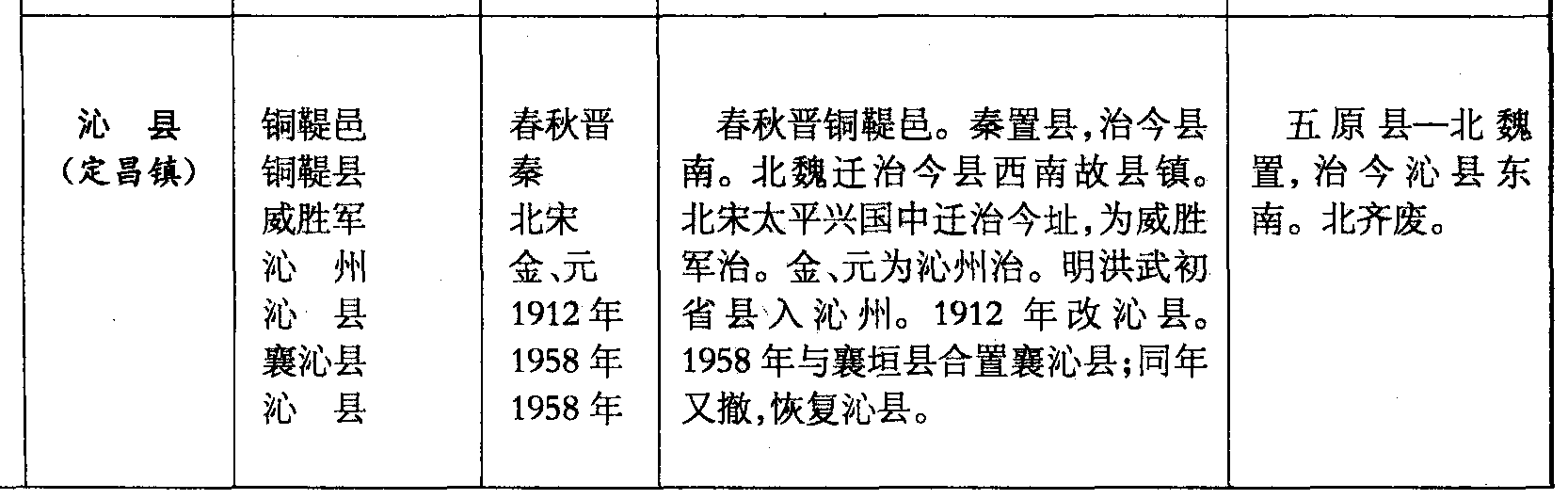 沁县(定昌镇)铜鞮邑铜鞮县威胜军沁州沁县襄沁县沁县春秋晋秦北宋金、元1912年1958年1958年春秋晋铜鞮邑。秦置县,治今县南。北魏迁治今县西南故县镇。北宋太平兴国中迁治今址,为威胜军治。金、元为沁州治。明洪武初省县入沁州。1912年改沁县。1958年与襄垣县合置襄沁县;同年又撤,恢复沁县。五原县—北魏置,治今沁县东南。北齐废。
