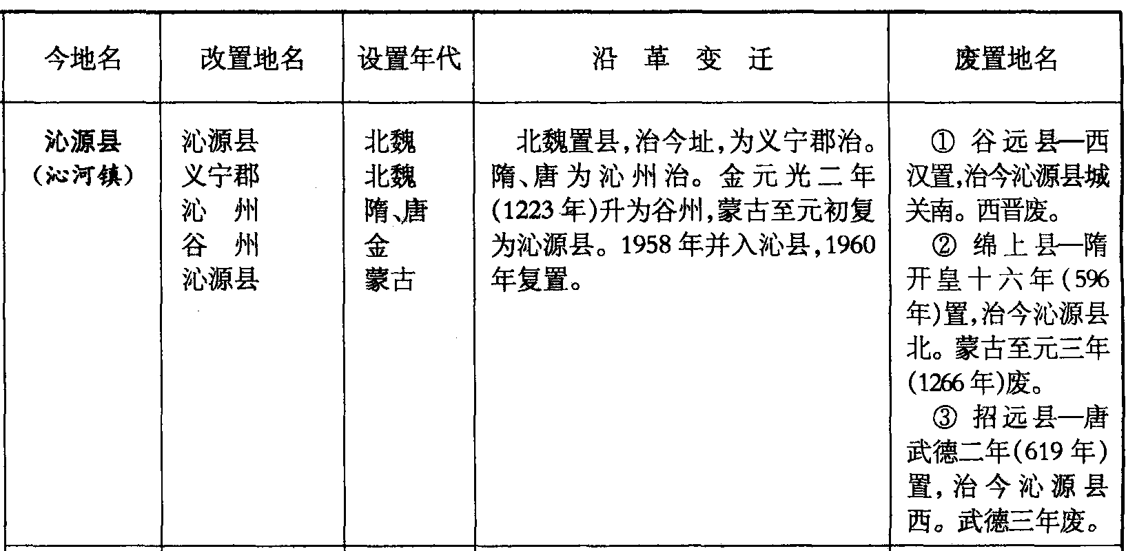 沁源县(沁河镇)沁源县义宁郡沁州谷州沁源县北魏北魏隋、唐金蒙古北魏置县,治今址,为义宁郡治。隋、唐为沁州治。金元光二年(1223年)升为谷州,蒙古至元初复为沁源县。1958年并入沁县,1960年复置。❶ 谷远县—西汉置,治今沁源县城关南。西晋废。❷ 绵上县—隋开皇十六年(596年)置,治今沁源县北。蒙古至元三年(1266年)废。❸ 招远县—唐武德二年(619年)置,治今沁源县西。武德三年废。