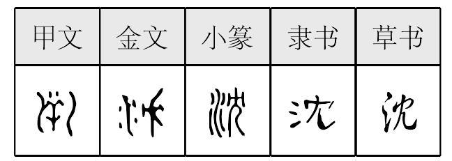 沈 ☚ 濛 涵 ☛ 沈瀋shěn沈字甲骨文象投牛或羊于水中之形,一种祭祀名称。西周后从水,冘声。冘是何(荷)和担(擔)等的本字。中古以后读yín。古与担同音。如冘耽耽(dān)例。沈声母古代也是舌尖音,如赡(shàn)擔(担的繁体字)、单禅(又读chán)例。沈本没入水中义,读chén,现规范作沉,见《通用字表》。沈专读shěn,通瀋,古代形声字,汁液义,如:墨沈未干。现作沈的繁体字。见《总表》。假借为水名和地名。如:沈阳。又姓。 沈瀋★繁◎常★常◎常