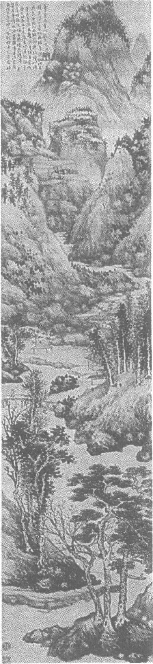 明。沈周(见《沈周庐山高图轴》条目)绘。纸本墨笔。纵163.5厘米,横37.2厘米。北京故宫博物院藏。此图是仿董源、巨然笔法画山水,为沈周中年的代表作。远处,山峦圆浑,多置平棋,山头密攒苔点,山脚卵石堆磊。采用披麻皴,运笔流畅,淡墨皴染,浓墨点缀等的画法,都得到董、巨的遗韵。近景坡石上排列挺拔的树木,与远景辉映,形成高峻的气势。在远山与近景之间,有一条蜿蜒曲回的溪水从山麓深处流躺下来,沿岸还画有行人、板桥、舟樯、草亭、茅屋等。整个布局有着独特的匠意,平添了生活情趣,有贴近生活的亲切感。整个画面,构图繁复,笔墨苍润,意境幽深而高远,全幅画布局丰满,不留空隙余地,作如此长林巨壑之景,尤为少见。笔墨的运用上较前人也更加潇洒灵活。左上自题诗、跋:“岁晚天寒日,柴门客到时,吾家原有好,奠甫惟旧私……”下钤〈启南〉印一方。