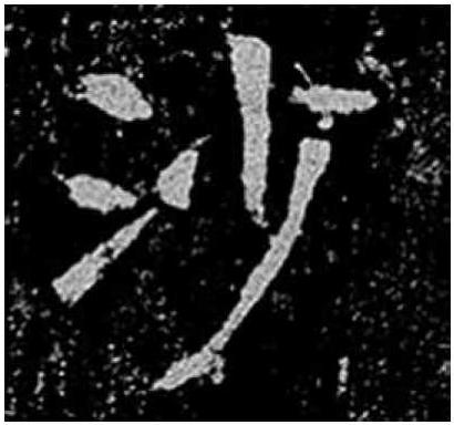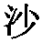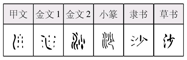 沙 甲骨文; 金文; 篆shā[氵(水,意符)+ 少(沙本字,聲意符) →沙(《説文》: “沙,水 文石也。從水,從少。水少沙見。楚東有沙水。 ,譚長説,沙或從少。”沙,初文原意指“沙灘上的沙子”。石頭經風化碎裂,雨水冲刷,流入江河湖海。經浪拍打,推至水邊成沙,沙爲碎細石粒,無凝聚力。 故有“一盤散沙”之説。引申爲像沙之物〈豆沙、蓮子沙〉。飛沙擊物發出“沙沙聲”,擬爲“沙”的讀音由來。聲帶嘶啞〈發出“沙啞聲”〉。)] 《詩經·大雅·鳬鷖(fú yī)》:“鳬鷖在沙,公尸來燕來宜。”(野鴨、水鷗沙灘,主祭赴宴吃得好。) 《妙法蓮華經·方便品》:“乃至童子戲,聚沙爲佛塔。”(注:“聚沙成塔”一語源於此。) [宋] 蘇軾《浣溪沙》:“輕沙走馬路無塵。”(注:沙比塵土粗而重,難以揚起。蘇軾的詩詞貼近生活,貼近自然,觀察細微。) 沙shā(7画)