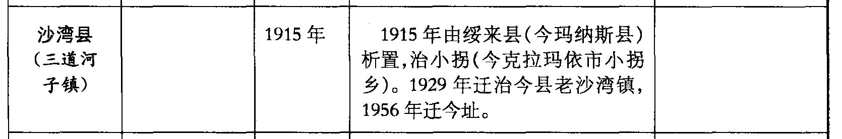 沙湾县(三道河子镇)1915年1915年由绥来县(今玛纳斯县)析置,治小拐(今克拉玛依市小拐乡)。1929年迁治今县老沙湾镇,1956年迁今址。
