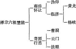 唐时,慧能门下分南岳怀让、青原行思两系。后南岳系分为沩仰、临济两宗,青原系下分为曹洞、云门、法眼三宗,此五宗各成一家,世称五家。宋时,临济宗又分为黄龙、杨岐两派,合前五家,号为七宗。