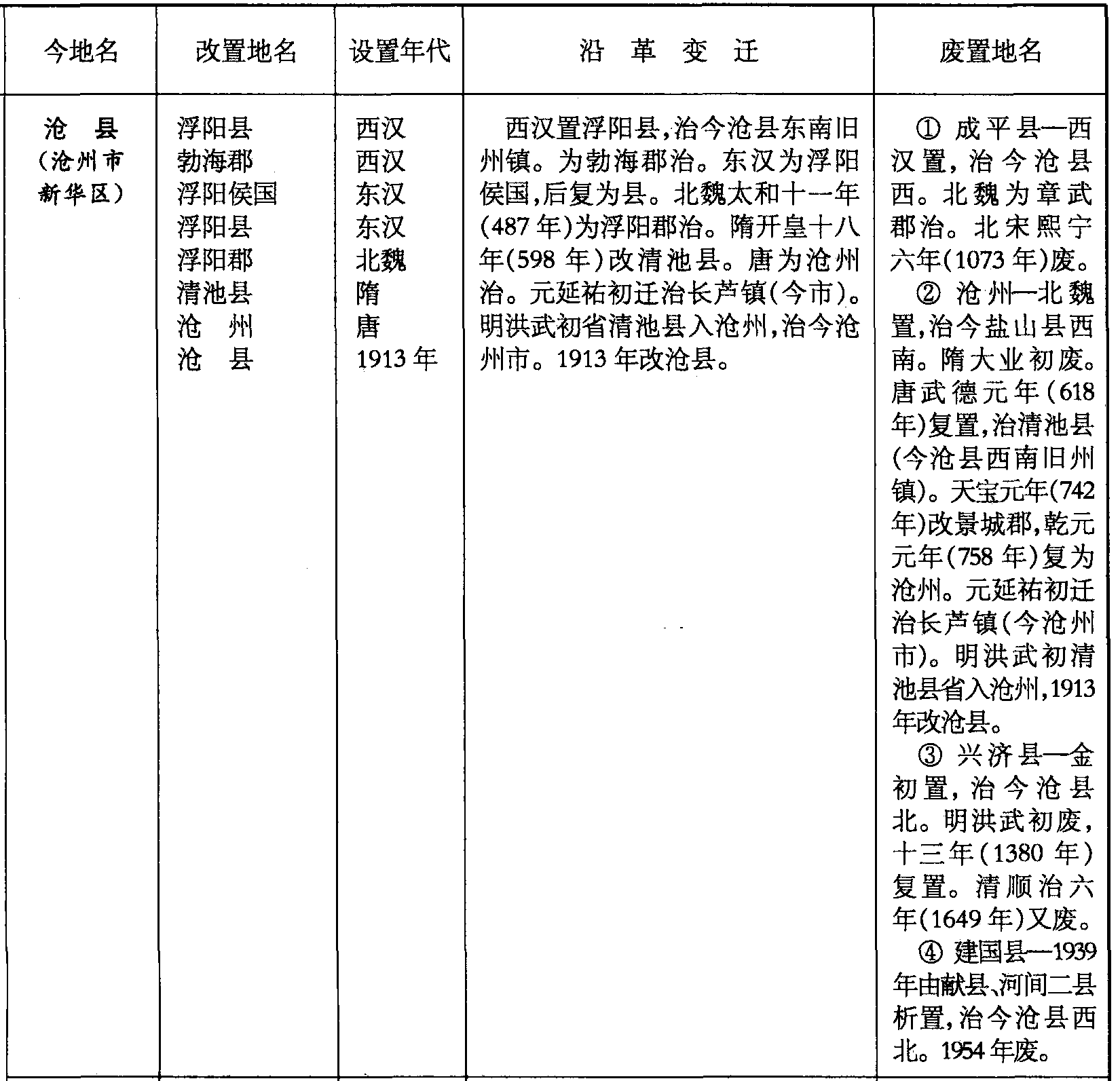 西汉置浮阳县,治今沧县东南旧州镇。为勃海郡治。东汉为浮阳侯国,后复为县。北魏太和十一年(487年)为浮阳郡治。隋开皇十八年(598年)改清池县。唐为沧州治。元延祐初迁治长芦镇(今市)。明洪武初省清池县入沧州,治今沧州市。1913年改沧县。
