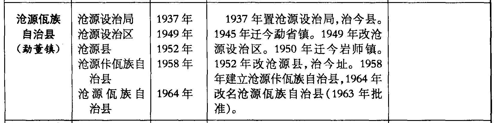 沧源佤族自治县(勐董镇)沧源设治局沧源设治区沧源县沧源佧佤族自治县沧源佤族自治县1937年1949年1952年1958年1964年1937年置沧源设治局,治今县。1945年迁今勐省镇。1949年改沧源设治区。1950年迁今岩师镇。1952年改沧源县,治今址。1958年建立沧源佧佤族自治县,1964年改名沧源佤族自治县(1963年批准)。