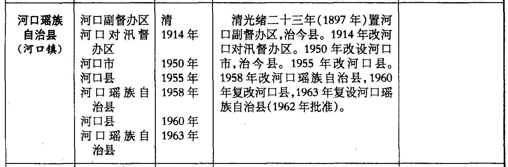 河口瑶族自治县(河口镇)河口副督办区河口对汛督办区河口市河口县河口瑶族自治县河口县河口瑶族自治县清1914年1950年1955年1958年1960年1963年清光绪二十三年(1897年)置河口副督办区,治今县。1914年改河口对汛督办区。1950年改设河口市,治今县。1955年改河口县。1958年改河口瑶族自治县,1960年复改河口县,1963年复设河口瑶族自治县(1962年批准)。