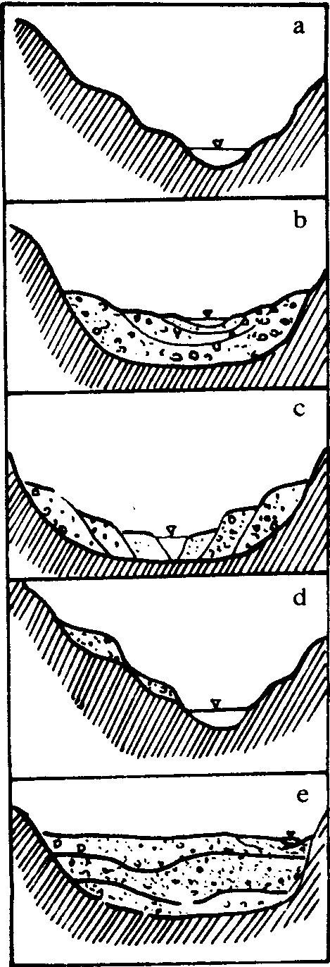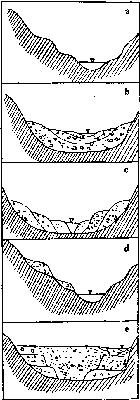 释义 | 河流阶地 河流阶地heliu jiedi河流发育到一定阶段,由于侧蚀和下切,使原来的河谷底部高出一般洪水水位,呈现为阶梯状平坦地面,称这种地形为河流阶地。阶地是由阶地陡坎、阶地面、阶地前缘和阶地后缘组成(图1)。阶地面比较平坦,微向下游倾斜。阶地面以下为阶地陡坎,坡度较大。阶地高度一般指阶地面与河流平水期水面之间的垂直距离。形成阶地的原因有:地壳的升降运动、气候的变化和侵蚀基准面的变化。因此对河流阶地的研究是研究新构造运动和气候变化的重要方法之一。根据阶地的结构和形态可以划分以下几种类型:侵蚀阶地、基座阶地、堆积阶地(内叠阶地、上叠阶地)和埋藏阶地。侵蚀阶地:又称基岩阶地,是在地壳强烈抬升的情况下,呈现以基岩构成的阶地台面,在台面上可保留极少的河流堆积物或完全缺失。在鉴别时应与由岩性的关系形成的阶台相区别(图2)。基座阶地:阶地上部由冲积物组成,下部出露基岩。由于构造抬升,河流下切深度超过了原河床堆积物的厚度,切至基岩内部而形成。堆积阶地:阶地是由冲积物所组成,其形成过程为,在侧蚀展宽的谷地中,堆积了河流相沉积物,然后河流下切形成阶地,但切割深度没有超过冲积层的厚度。堆积阶地在河流的中下游最为常见。堆积阶地依据两级阶地相互堆积和接触关系,又可分为内叠阶地和上叠阶地。内叠阶地是河流下切到早先堆积的底部,而后期的冲积层直接覆盖在基岩之上。上叠阶地是河流下切没有达到前期谷底的最深部,而后期冲积物是叠置在前一次冲积物之上。埋藏阶地是指早期因地壳抬升而形成的各种类型的阶地,而后因地壳下降将原来的阶地全部埋藏,称为埋藏阶地。如果某一地区一直处于下沉状态,早期并未形成阶地,这样只是沉积物相互叠加关系,不能看成为埋藏阶地。对河流阶地的研究可以反映河流发育历史、水系演变和新构造活动的强度并对寻找砂矿资源有重要意义。 图1 河流阶地形态要素图 R.河床;P.河漫滩;a.阶地前缘;d.阶地后缘;a、b、d.阶地面;af、ed.阶地陡坎;h1.阶地前缘高度;h2.阶地后缘高度;h3.第二级阶地前缘高度 图2 阶地的类型 a.侵蚀阶地;b.上叠阶地;c.内叠阶地;d.基座阶地; e.埋藏阶地 ☚ 河漫滩 洪积扇 ☛ 河流阶地 河流阶地Heliujiedi由于河流的侵蚀和堆积作用形成沿河谷两岸伸展,高出洪水期水位的阶梯状地形。一般河谷中常形成一级或几级阶地,每一级阶地都是由阶地面和阶地坎组成。阶地面比较平坦,微向河流倾斜。阶地面以下为阶地陡坎,坡度较大。阶地高度一般指阶地面与河流平水期水面之间的垂直距离。阶地的级数是由下而上顺序排列,高于河漫滩的最低一级阶地,称为一级阶地,向上依次为二级、三级等。在同一河谷横剖面上,阶地的相对年龄一般是低阶地新,高阶地老,阶地的海拔高度一般是从下游向上游增高。在较宽广的河谷底上,河漫滩占据大部分,河床只占一部分。由于流域内气候变化、地壳运动及河口海平面的变化,引起河流下切侵蚀,使新河床大幅度降低,原谷底河漫滩成为阶地,且超出一般洪水面以上。根据阶地的结构和形态可以划分以下几种类型:侵蚀阶地、堆积阶地(内叠阶地、上叠阶地)、基座阶地和埋藏阶地。 图1 河流阶地形态要素图 R.河床;P.河漫滩;a.阶地前缘;d.阶地后缘;a、b、d.阶地面;af、ed.阶地陡坎;h1.阶地前缘高度;h2.阶地后缘高度;h3.第二级阶地前缘高度 图2 阶地的类型 a.侵蚀阶地;b. 上叠阶地;c. 内叠阶地;d. 基座阶地;e.埋藏阶地 ☚ 河漫滩 洪积扇 ☛ 河流阶地由河流作用形成的,沿谷坡分布高出洪水位的阶梯状地貌。当地壳相对稳定,流水侧蚀和堆积作用,形成平坦的谷底和发育了河漫滩。后因地壳上升、基面下降或气候变化,促使河流下切,原已形成的平坦谷底和河漫滩相对抬高而成为阶地。 |