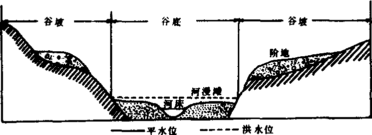 由经常性水流切割而成的纵长凹地称为河谷。沿河谷流动的水流称为河流,较大的河流经常有水,只在雨季或在暴雨后才有水的河流称为间歇河。河谷的基本形态可分谷坡与谷底两部。谷底比较平坦,由河床和河漫滩组成;谷坡分布在河谷的两侧,谷坡上常有阶地发育。谷坡与谷底交界处称为坡麓,谷坡上缘与高地面交界处称为谷肩。一条河流的不同地段,河谷发育和河谷形态是不相同的。山区河流,因坡降较大,下蚀作用强烈,往往形成深切峡谷,谷底多急流险滩。河谷形态为谷坡直立,谷底全部为河床所占据,形成V形谷地,如我国金沙江虎跳涧。当河流进一步发育,流水侧蚀作用加强,使河床拓宽,并发育曲流和河漫滩。谷坡后退,河谷横剖面呈浅宽U形。随着谷坡的剥蚀和沟谷的侵蚀,地势逐渐开扩变缓,在广阔的河漫滩或冲积平原两侧有时残存有丘陵或缓倾斜坡地。河流出山后,因水流变缓,以堆积作用为主,形成了以自然堤、河漫滩和现代河床组成的河谷形态。河床的演变主要受上游来沙来水的条件控制和局部地区构造的影响,形成多种多样的河床形态,如顺直微弯型、弯曲型、分汊型、游荡型河床等。