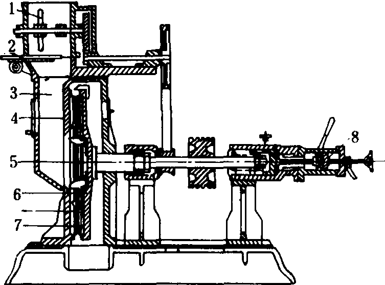 释义 | 油料剥壳机oil seed decorticator通过机械方法破碎和剥离油料种子外壳的机器。油料种子的外壳多由木质纤维素组成,并含有一定的色素,而含油量极少。在油料制油前,用油料剥壳机将外壳剥掉,可以降低油分的损失,改善毛油和饼粕的质量,提高制油设备的处理量,减少机件的磨损。 图1 圆盘式剥壳机 1.喂料翼; 2.调节板; 3.通道; 4.固定圆盘; 5.转动圆盘; 6、7.磨片; 8.圆盘间隙调节器 圆盘式剥壳机的主要参数是磨片外径,有915、864、710和610毫米等几种规格。转动圆盘的转速为900~1 200转/分,配备30、22、14和7.5千瓦的电动机。剥壳能力依磨片外径和油料品种的不同而异,较小的为12吨/日,一般为35吨/日左右,较大的达50~60吨/日。对棉籽的剥壳率可达99%以上。 刀板式剥壳机 结构如图2。主要工作部件是刀板转鼓和刀板座,刀板转鼓和刀板座上均装有刀板。刀板座呈凹形,通常由上下两块装配成一个整体,并带有调节机构,可根据油料颗粒的大小调节刀板座与刀板转鼓之间的间隙。当刀板转鼓旋转时,在刀板之间产生剪切作用,使油料的外壳破裂和脱落。主要适用于棉籽,特别是带绒棉籽的剥壳,剥壳效果较好,剥壳后的籽仁较完整,仁、壳易于分离,且皮壳碎屑较少,因而损失的油分亦较少。 图2刀板式剥壳机 刀板转鼓的直径和长度是刀板剥壳机的主要参数,一般为φ450×1200毫米,较大的达∅595×1 220毫米。主轴转速为950~1000转/分,配用功率20~30千瓦。剥壳能力一般为50~80吨/日,较大的达100~110吨/日。剥壳率为95%左右。 刀笼式剥壳机 主要由剥壳辊(或称刀轮)和笼篦组成。专用于花生剥壳,有锤击式和条杆辊筒式两种。锤击式剥壳机的剥壳辊是一个带锤片的转子,其下方是由方形栅条构成的半圆形笼篦。花生从进料机构落下时,旋转的锤片将果壳打破。未打破的花生则落入剥壳辊与笼篦之间继续受到打击,直到果壳破裂为止。已剥壳的花生仁和破碎的果壳穿过笼篦缝隙下落,果壳和碎屑被吸风系统吸走。剩下的花生仁和少量带壳的小粒花生则进入筛选机进行分离。被分离出来的带壳花生被送回剥壳机继续剥壳。剥壳辊的直径和长度一般为φ612×570毫米,转速为100转/分左右,配备10千瓦电动机,剥壳能力达48吨/日。条杆辊筒式剥壳机是用辊筒圆周上条杆的挤压、搓碎作用,使花生果破碎。农村小型油厂使用的条杆辊筒直径为250毫米,长300毫米,转速175~200转/分,配套动力1.7千瓦,剥壳能力可达600千克/小时。 刀笼式剥壳机剥壳辊的直径和长度一般为∅612×570毫米,笼篦的直径和长度相应为φ650×600毫米。剥壳辊的转速为100转/分左右,配备10千瓦电动机,剥壳能力达48吨/日。 离心式剥壳机 以甩盘和冲击板为主要工作部件的剥壳机,有立式和卧式两种。 卧式离心剥壳机的甩盘在垂直面内旋转,由两块圆形钢板制成,在两块圆形钢板之间径向安装着几块弧形叶片。冲击板用橡胶制成,安装在壳体内壁。油料从料斗进入甩盘中心,在甩盘高速旋转所产生的离心力的作用下,沿弧形叶片甩向冲击板,使外壳破裂脱落。已脱壳的油料从出料口排出,然后进行壳仁分离。甩盘的外径一般为φ410毫米,转速为1 660~2400转/分,配用功率2.5千瓦。剥壳能力为800千克/小时左右,剥壳率达90%。 立式离心剥壳机又称透平剥壳机,其甩盘内装有打板。当油料落下时,旋转的打板将外壳打破。未破裂的油料则被弹向甩盘周围的冲击板,使外壳受冲击作用而破裂。图3为一种新型的立式离心剥壳机,采用三层重叠的甩盘,每层甩盘由底板、盖板和叶片组成。这种剥壳机优越于卧式离心剥壳机,其剥壳能力较大,处理葵花籽可达100吨/日,剥壳率可达90%以上。 图3三层甩盘立式离心剥壳机 辊式剥壳机多用于篦麻籽剥壳。其结构原理与对辊式轧坯机类似(见油料轧坯机)。主要工作部件是一对光面轧辊,两轧辊长约800~1 000毫米,转速相同,约230转/分。两轧辊间距可以调节,一般为3~4毫米。油料进入两轧辊之间,在挤压力作用下达到剥壳目的。剥壳后的混合物落入下面的筛选机,并通过吸风系统进行壳仁分离。此外,还有一种辊式剥壳机由一个辊筒及其外圆上排列的许多滚柱所组成,适用于农村和小型油厂的花生、桐籽和茶籽剥壳。其辊筒的直径和长度为φ250~300毫米,转速为175~200转/分,配用功率1.7千瓦。剥壳能力达600千克/小时。 油料剥壳机oilseeds huller用来剥除油料籽实皮壳以提取种仁的机械。油料的油脂大部分存在于种仁内,皮壳部分含油量很少,但其重量有的却占50%以上,在制油生产中会降低出油率和油脂质量,且增加生产中的困难,必须剥壳处理使仁壳分离。油料剥壳机械有:靠搓碎作用剥花生果、油菜籽的圆盘剥壳机;靠剪切作用剥棉籽壳的刀板式剥壳机;靠撞击作用剥向日葵籽的离心式剥壳机;靠挤压作用剥蓖麻籽的轧辊剥壳机等。 |